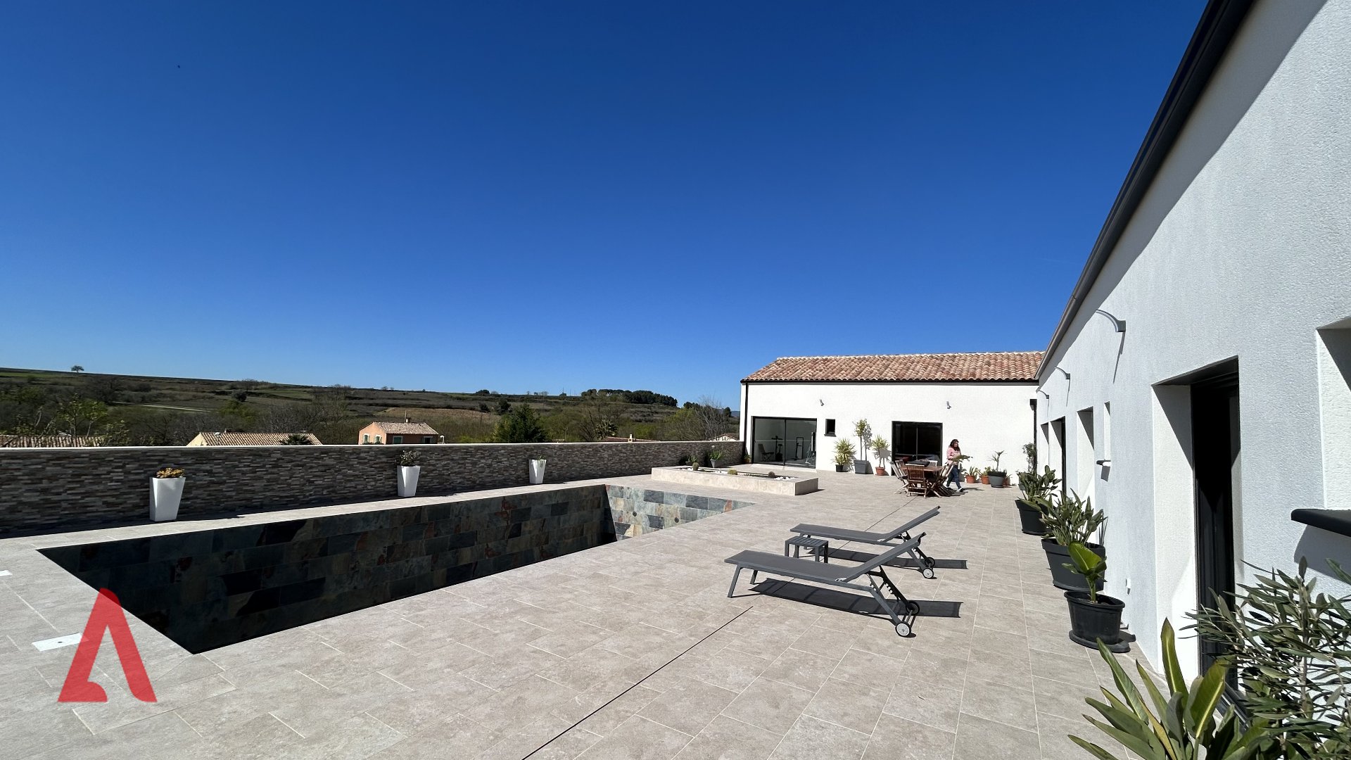 À l'extérieur, une exceptionnelle terrasse de 226 m² prolonge harmonieusement les espaces de vie et permet de profiter pleinement du panorama et de l'art de vivre méditerranéen. La piscine 10x4, chauffée et traitée au sel, s'intègre parfaitement dans cet environnement privilégié. Un terrain de pétanque et un potager viennent compléter cet espace extérieur soigneusement aménagé.