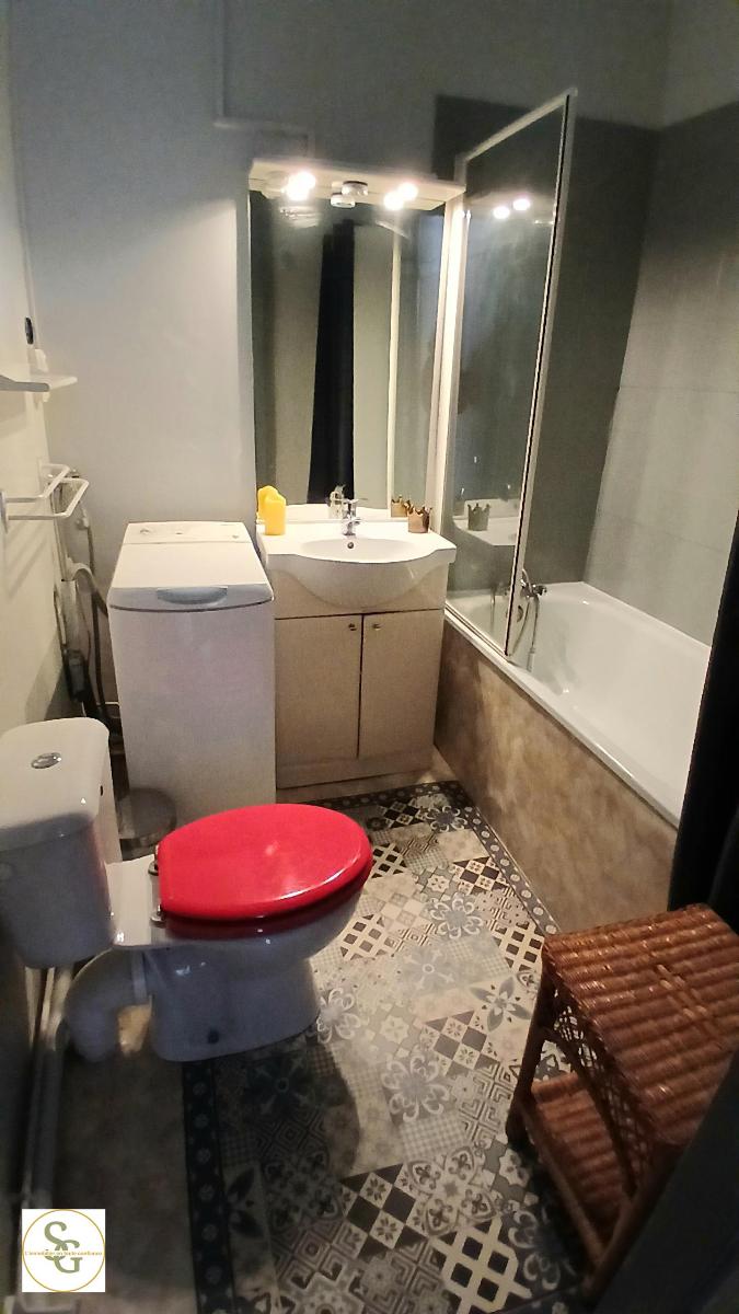 La salle de bain comprend baignoire, lavabo, WC, ainsi qu'un cumulus et un emplacement pour lave-linge.