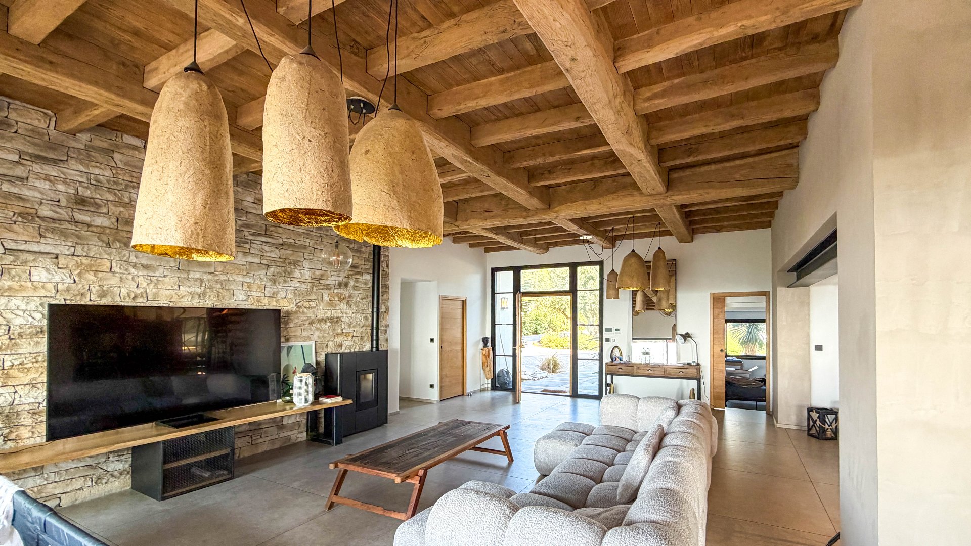 Les volumes intérieurs impressionnent par leur générosité et leur luminosité. La pièce de vie, spectaculaire, accueille un salon raffiné, une salle à manger sublimée par un plafond cathédrale, ainsi qu'une cuisine américaine entièrement équipée. Une arrière-cuisine et une buanderie complètent cet espace pensé aussi bien pour le quotidien que pour recevoir.