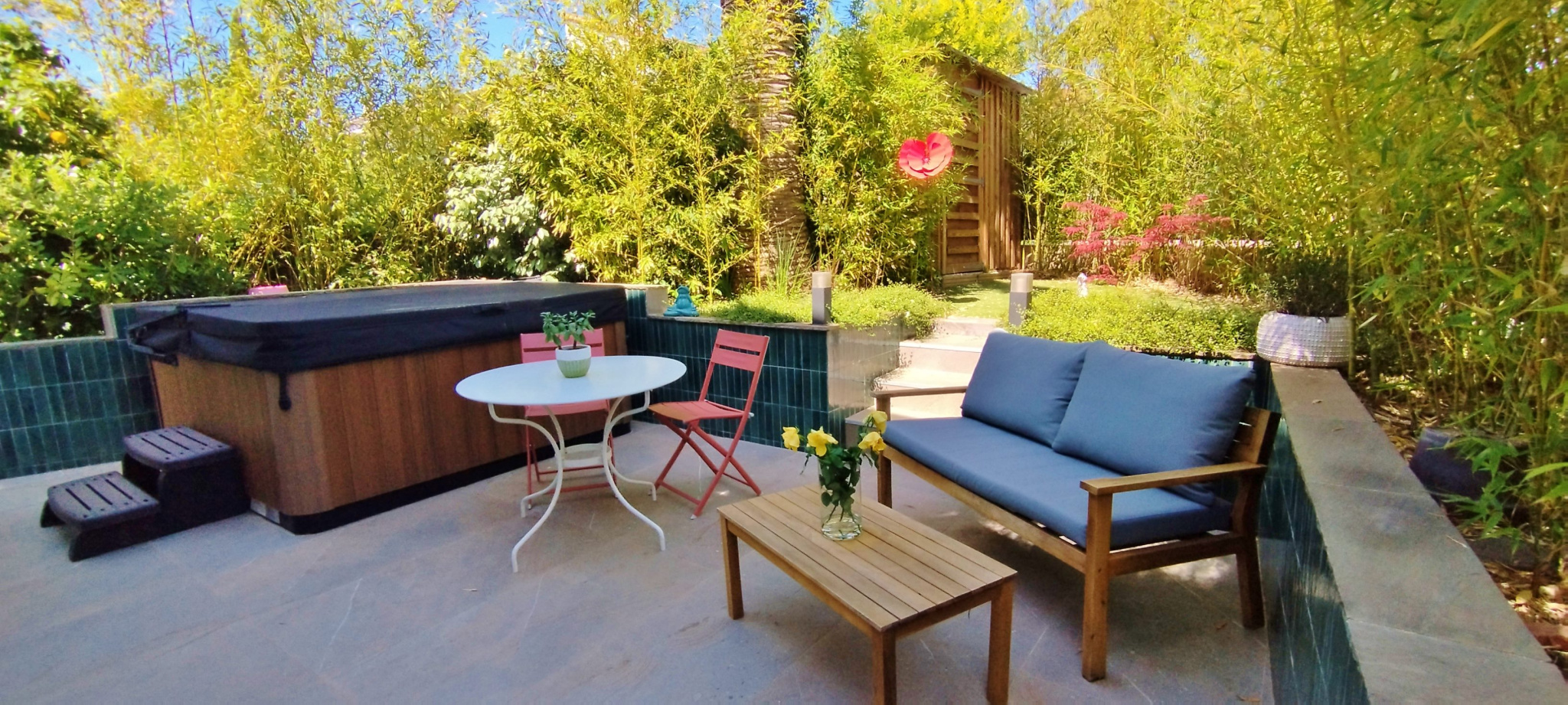 Le jardin, complanté d'essences méditerranéennes (palmiers, olivier, faux poivrier), permet de profiter pleinement de la double exposition Nord/Sud à toute heure de la journée. Le jacuzzi neuf, à l'abri des regards, apporte une touche de détente, comme un clin d'oeil à l'art de vivre du Sud.
