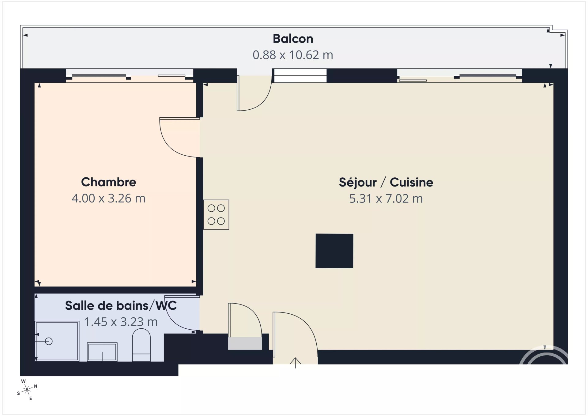 L'appartement est en bon état, il dispose d'un séjour/cuisine meublée et équipée de 37m², une grande chambre de 13m², une salle de bains avec WC moderne et un grand balcon de 7.20m².