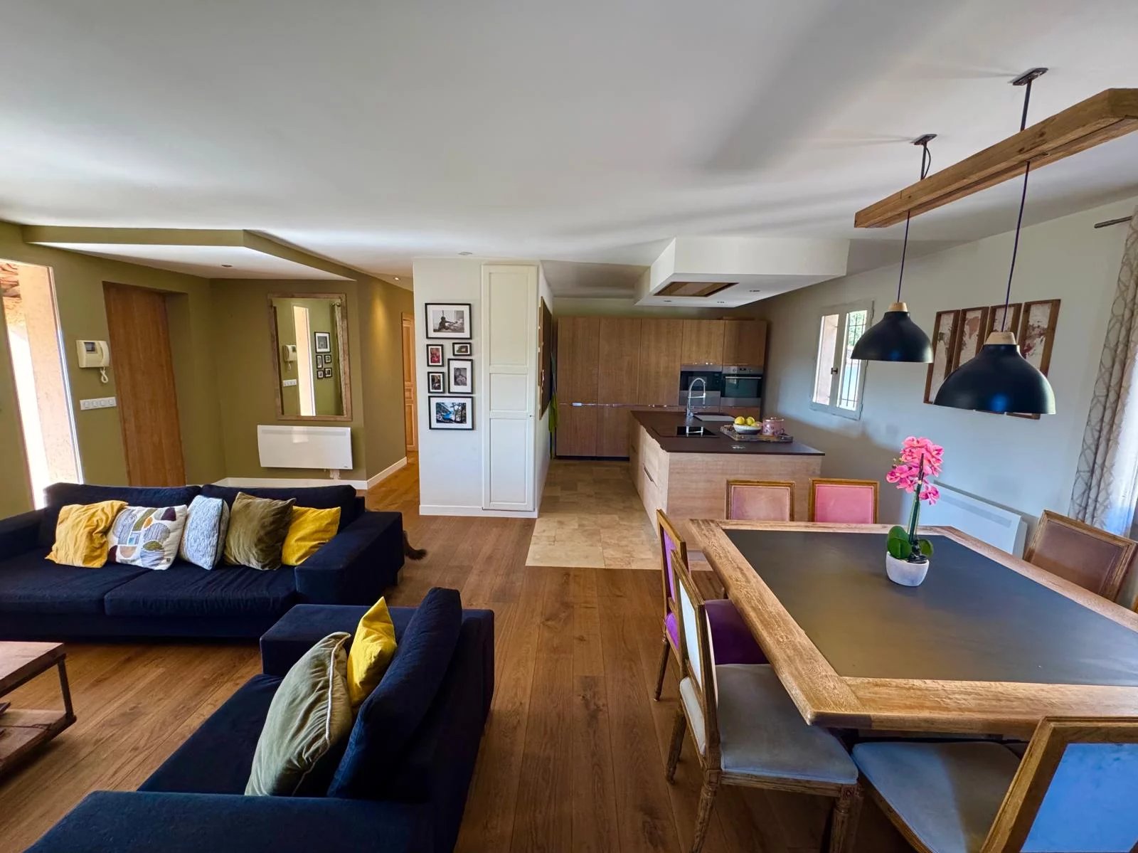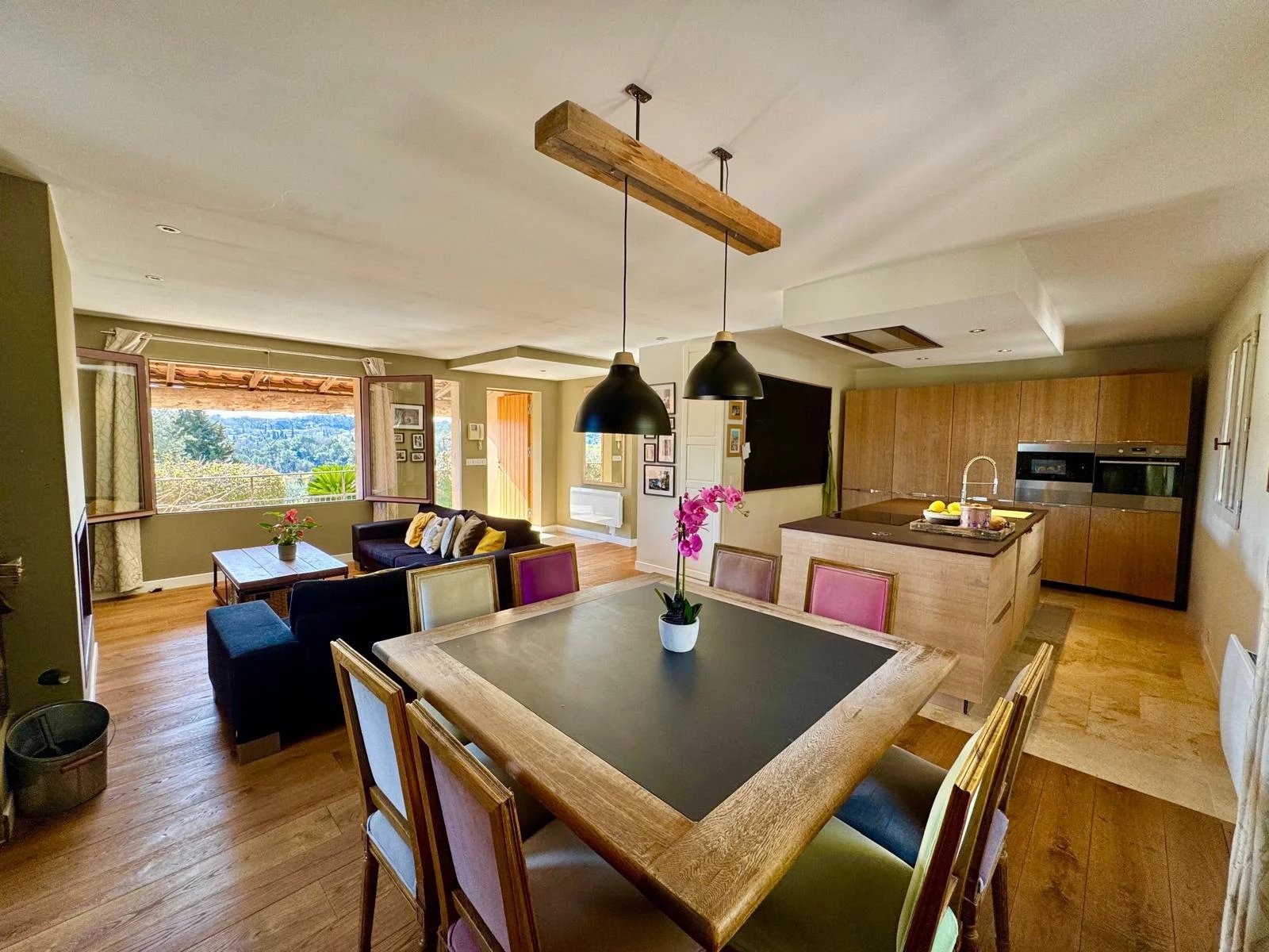 une spacieuse terrasse couverte prolonge les espaces de réception vers un superbe espace piscine ouvert sur le panorama. Piscine au sel, terrain de pétanque, jardin généreux… chaque détail invite à profiter du climat méditerranéen.
