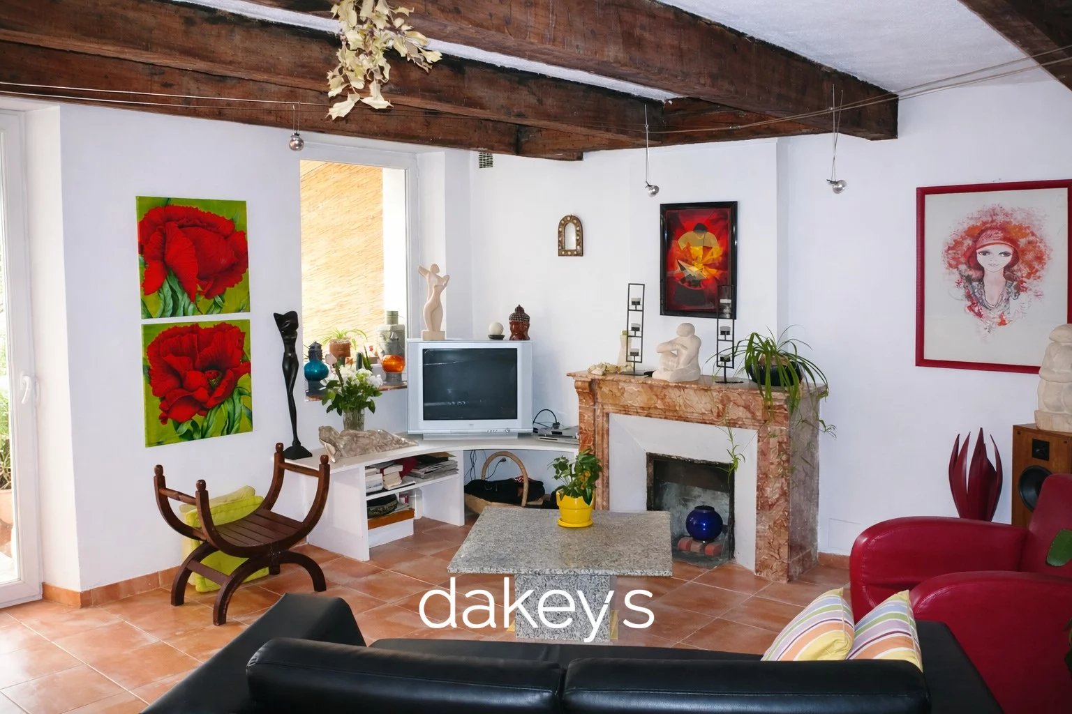 En rez-de-jardin, le bien propose une belle pièce de vie chaleureuse avec poutres apparentes et cheminée, ainsi qu’une cuisine ouverte sur le salon, créant un espace convivial et lumineux, prolongé directement sur le jardin.