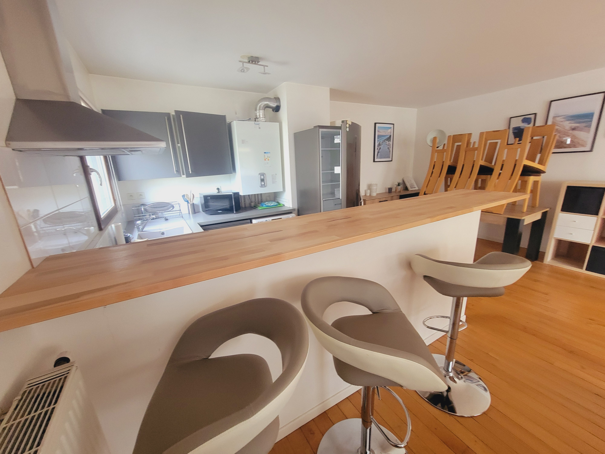 Dès l'entrée, vous serez séduit par une spacieuse pièce de vie baignée de lumière avec cuisine moderne entièrement équipée ouverte sur le séjour, offrant un espace convivial et chaleureux. Celle-ci s'ouvre directement sur une grande terrasse, parfaite pour profiter des beaux jours, recevoir ou simplement se détendre.