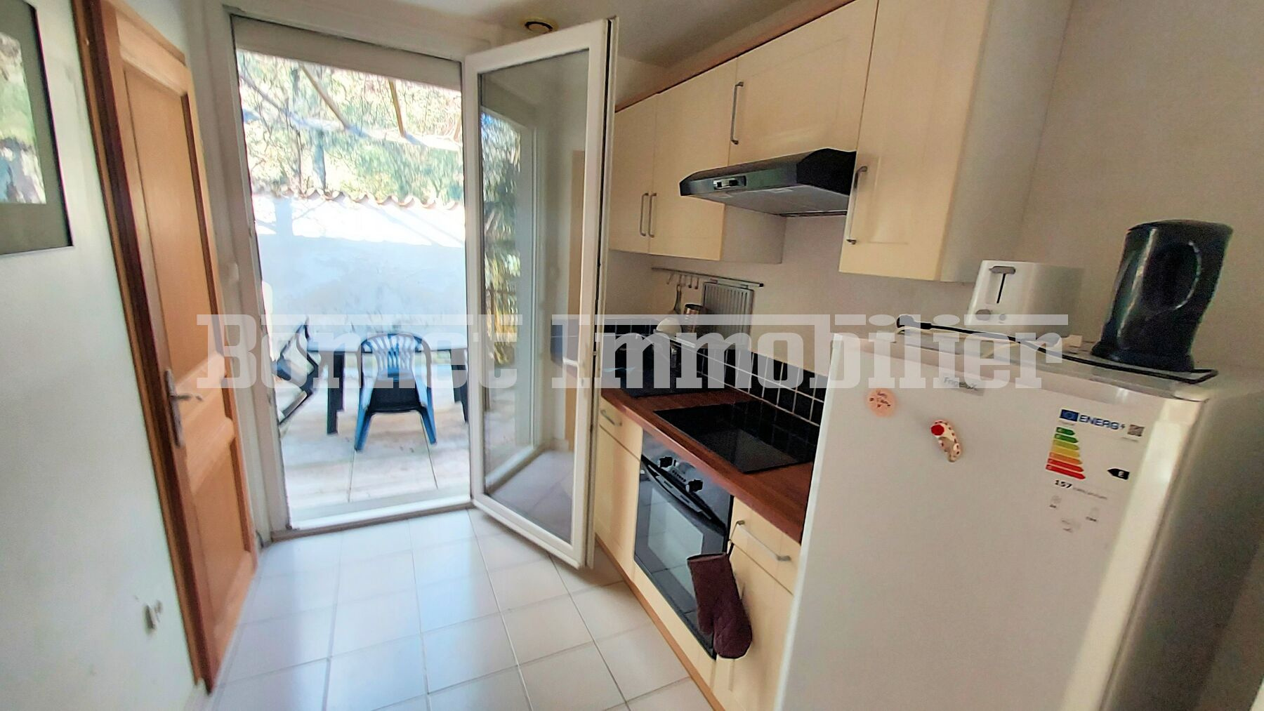 À l'extérieur, l'ensemble dispose d'un sympathique jardin d'environ 450 m2 nécessitant peu d'entretien avec quelques beaux oliviers, et d'une grande terrasse agréablement ombragée côté nord.