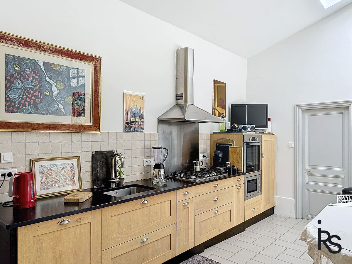 Une magnifique maison de Maître de 260 m2 habitables avec une terrasse et un jardin attenant clos d'environ 300 m2, sans vis-à-vis. Au rez-de-chaussée de cette propriété, un spacieux hall d'entrée dessert une ancienne salle d'eau, un garage, une salle de jeux, deux pièces anciennement à usage de bar et de restaurant. Au premier étage, une pièce de vie avec un coin cuisine équipée et une grande ouverture en aluminium sur la terrasse et le jardin en contrebas. Au même étage, nous trouvons une buanderie et un W.C., quatre chambres dont deux avec une salle de bains et l'une avec une salle d'eau, un salon d'hiver et un bureau-bibliothèque. Au deuxième étage, une chambre, un salon-bureau et une salle de bains avec W.C. et un demi-étage plus haut, un grenier. Une dépendance voûtée d'environ 50 m2 accessible depuis la rue. Chauffage central au gaz. Tout à l'égout.