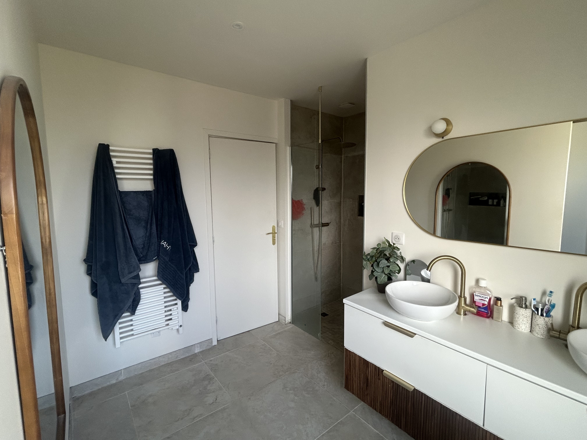 Elle est composée au rez-de-jardin d'une pièce de vie avec salon, séjour et cuisine ouverte, donnant directement sur une terrasse exposée plein sud, d'une chambre, d'une salle d'eau avec dressing, d'un WC indépendant et d'un rangement sous escalier.
