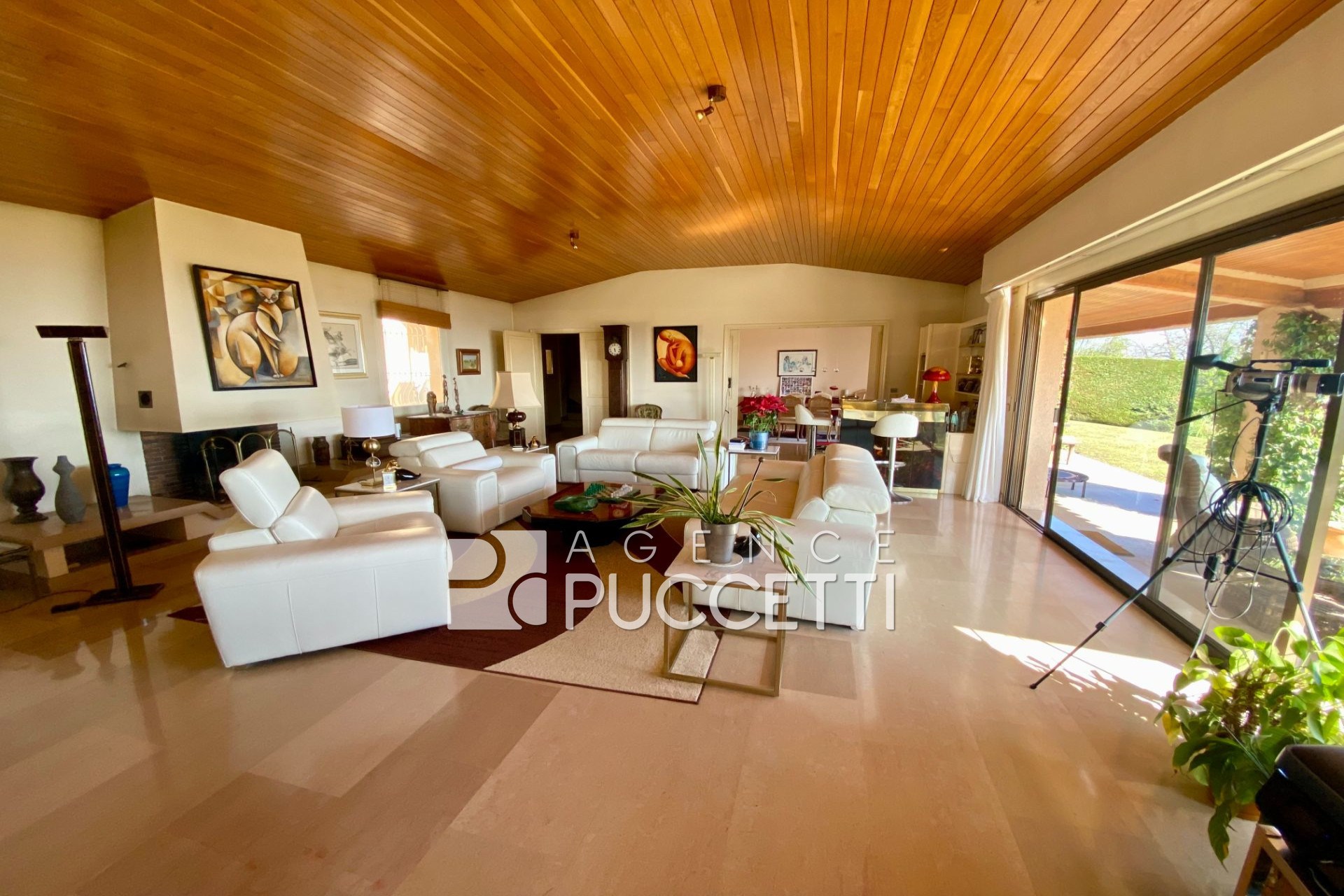 La villa élevée sur sous-sol et vide sanitaire comprend au niveau rez-de-chaussée, une entrée, un très vaste séjour de 70 m² avec de larges ouvertures, une salle à manger de 23 m² ouverte sur le séjour, une cuisine indépendante équipée, dégagement, une chambre de maître avec salle de bains et wc, une buanderie, un wc invité.