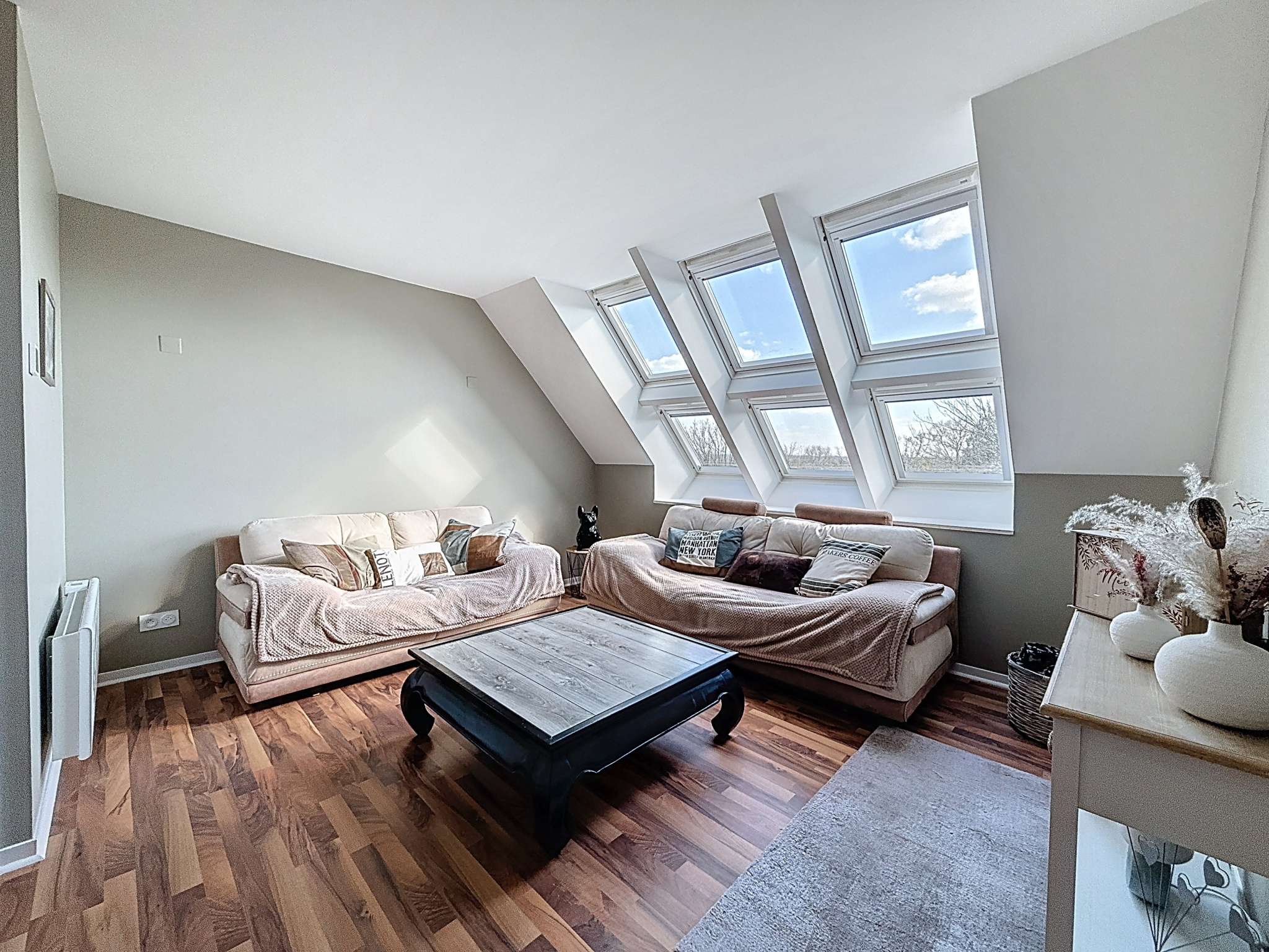 A l'étage, une grande mezzanine, 3 chambres dont une avec salle de bains et dressing, une deuxième salle de bains et un WC.