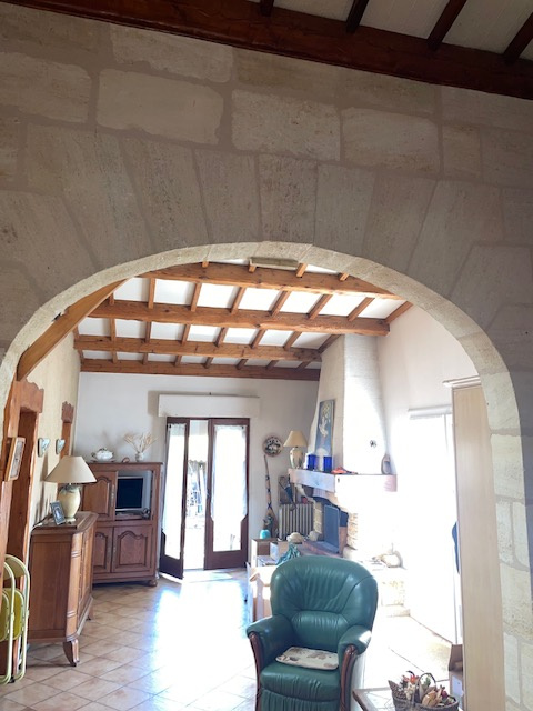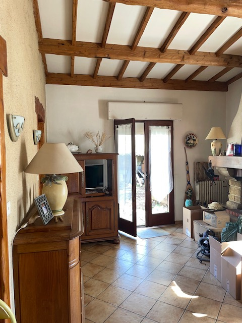 Une entrée avec cheminée , un grand salon séjour de plus de 45M2 , une cuisine indépendante et un cellier , deux chambres , une salle de bain , un toilette .