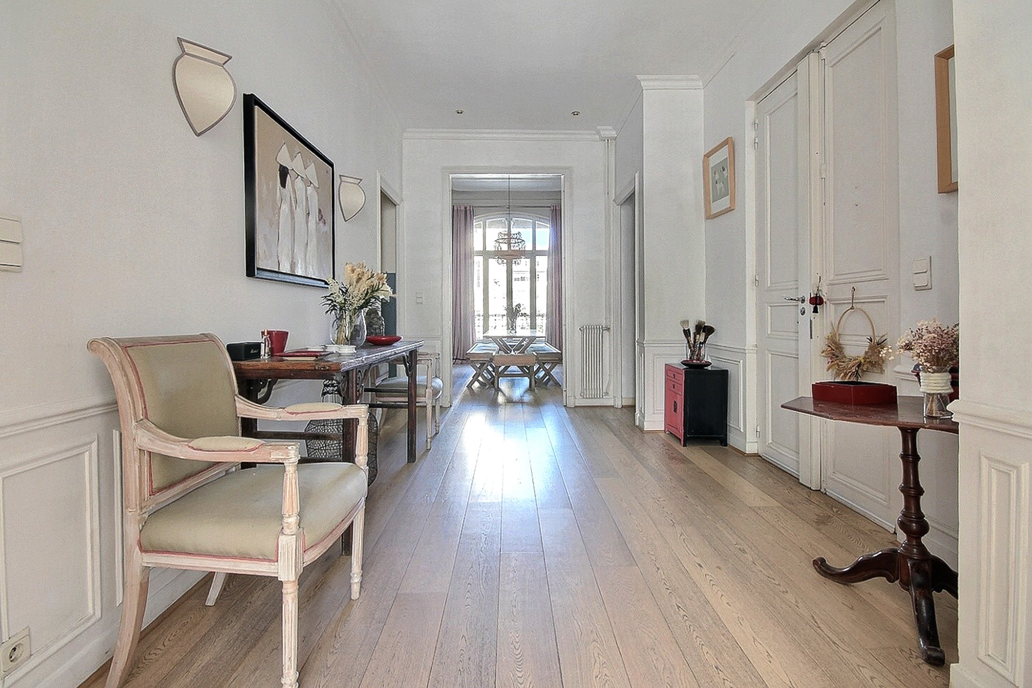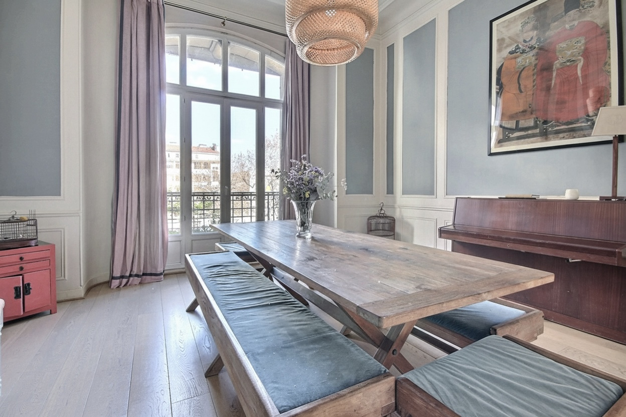 Rue Paradis, entre la place Delibes et la place Castellane, découvrez cet appartement de type 5/6 occupant la totalité du premier étage d'un bel immeuble de caractère. Ce généreux plan traversant (ouest/est) développe une superficie de 165 m2 carrez et profite d'une belle luminosité et affirme un caractère bourgeois et des volumes remarquables. L'espace se compose d'une vaste entrée qui dessert côté ouest sur cour au calme, un salon avec cheminée et une belle cuisine familiale ayant accès à un balcon, une grande chambre parentale avec dressing et salle de bains. Côté est, vous disposerez d'une grande salle à manger, d'une chambre de 17m2 avec salle d'eau et de deux chambres avec mezzanine pouvant être à nouveau réunies en une grande chambre. Très belle hauteur sous plafond, parquet massif, moulures, un bien de caractère, parfaitement entretenu situé à deux pas des écoles recherchées, des commerces, commodités et accès autoroutiers, ce bien de cractère sera parfaitement adapté à une ville familliale ou à une utilisation en profession libérale. Chauffage individuel au gaz, double vitrage, grande cave au sous-sol, possibilté d'achat d'un garage fermé à proximité immédiate. Faibles charges : 102 euros mensuels. Taxe foncière 2800 euros. Contact : Jérôme Daher 06 82 56 98 98 ou agence 04 91 47 56 05 Non détention de fonds.