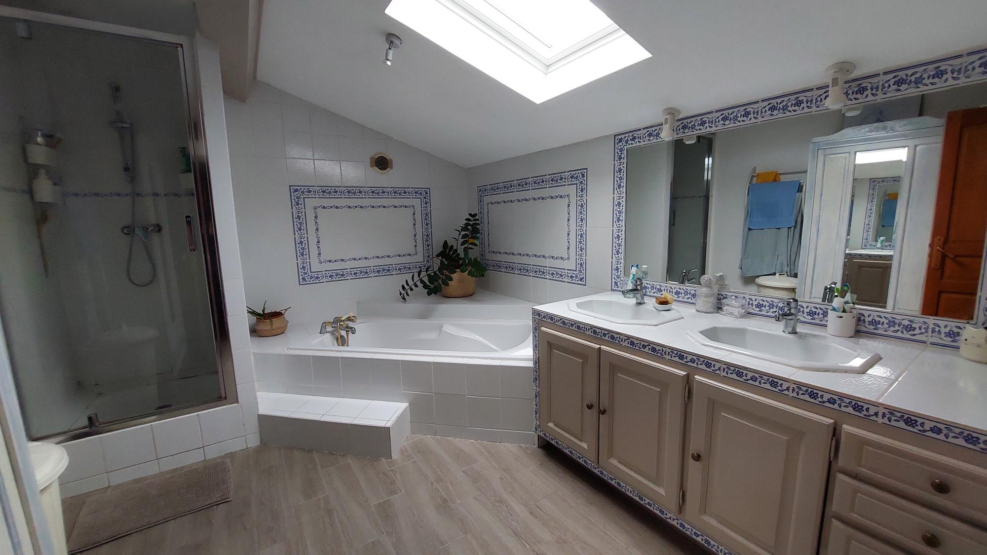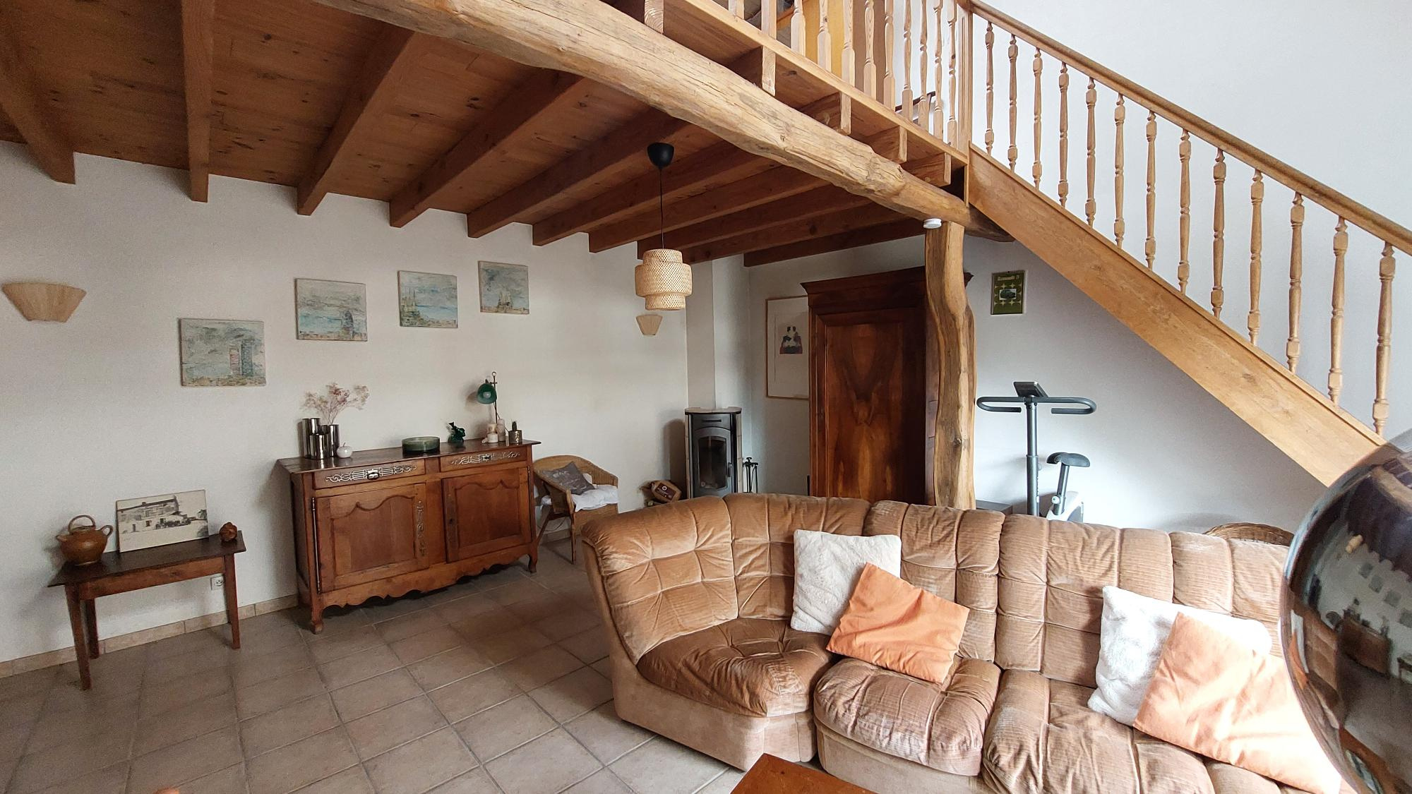 A l'étage: bureau en mezzanine, 2 grandes chambres, salle de bains et wc.
