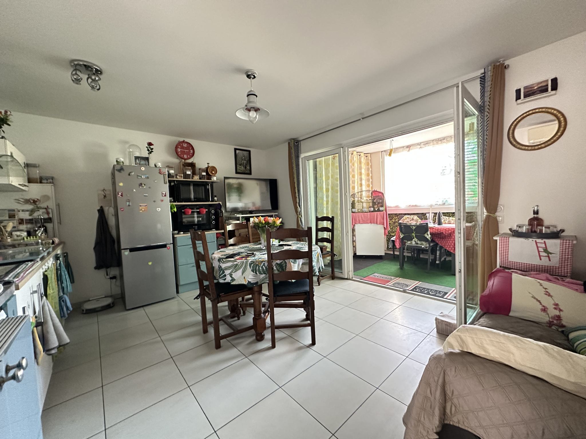 L'appartement se compose d'un séjour lumineux ouvert sur une cuisine, le tout donnant sur une grande terrasse. Il dispose également d'une chambre confortable, d'une salle d'eau et d'un WC séparé.