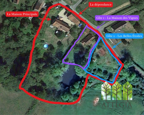 L'ensemble comprend une spacieuse maison principale ainsi que deux gîtes totalement indépendants, le tout implanté sur un terrain paysager de 7 523 m² comprenant un étang, un verger et de magnifiques jardins arborés.