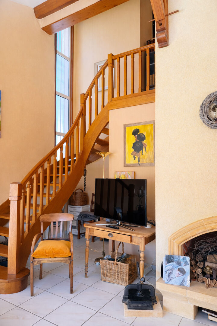 Développant environ 192 m² habitables, cette maison offre de beaux volumes et un fort potentiel. Dès l'entrée, un vaste hall avec rangements dessert une agréable pièce de vie baignée de lumière, composée d'un salon-séjour chaleureux avec cheminée à foyer ouvert. Une cuisine indépendante, accompagnée de son cellier, complète cet espace de vie et s'ouvre sur une grande terrasse.