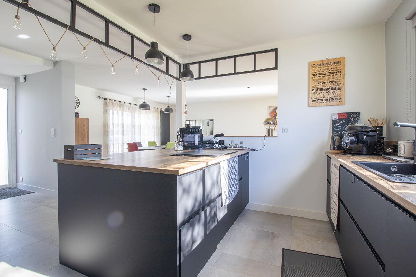 Principalement de plain-pied, la maison s'ouvre sur une entrée avec placard, puis une vaste pièce de vie traversante baignée de lumière, avec cuisine aménagée et équipée autour d'un îlot central.