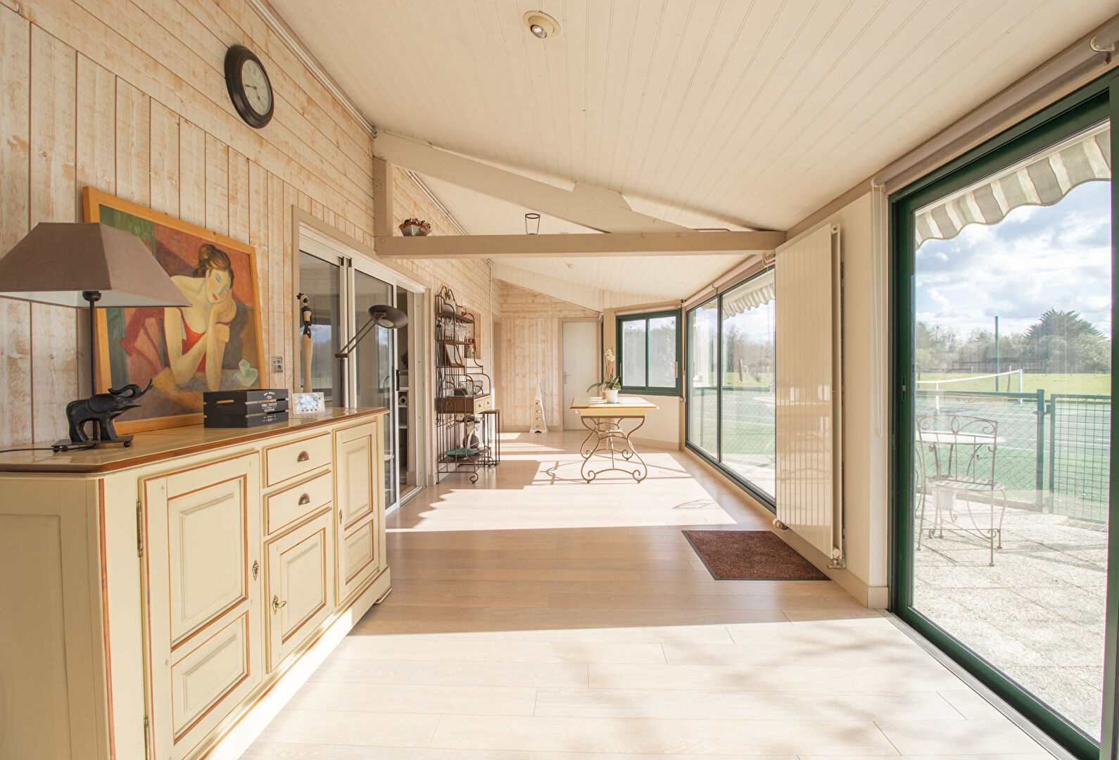 Une véranda prolonge harmonieusement l'espace de vie et donne accès à des espaces complémentaires : atelier, espace de rangement, bureau avec placard, ainsi qu'à l'étage deux chambres en enfilade. Cet ensemble offre un fort potentiel, idéal pour une activité libérale ou la création d'un logement indépendant.