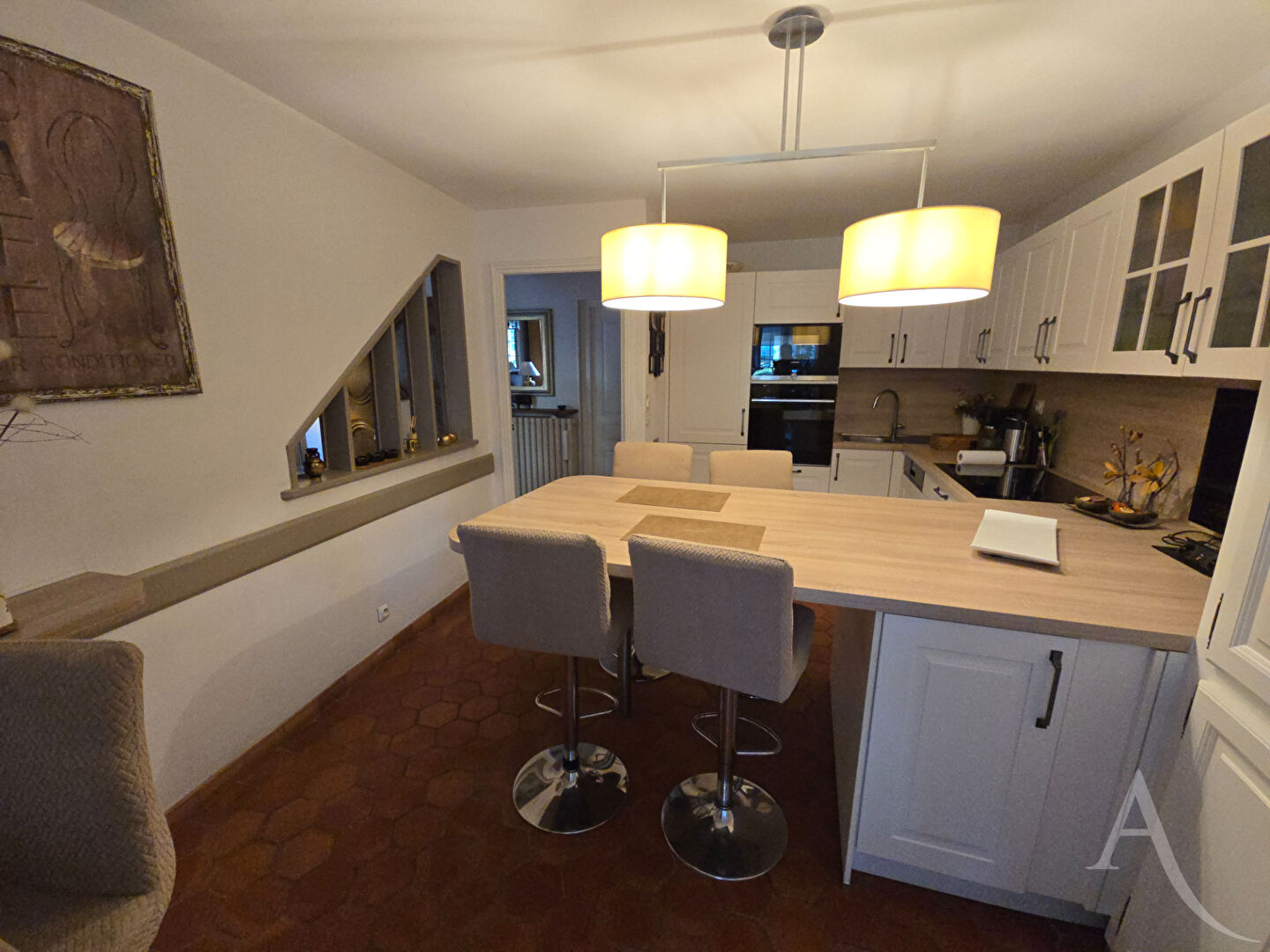 Espace vie : Salon chaleureux avec insert, salle à manger séparée et cuisine moderne équipée.