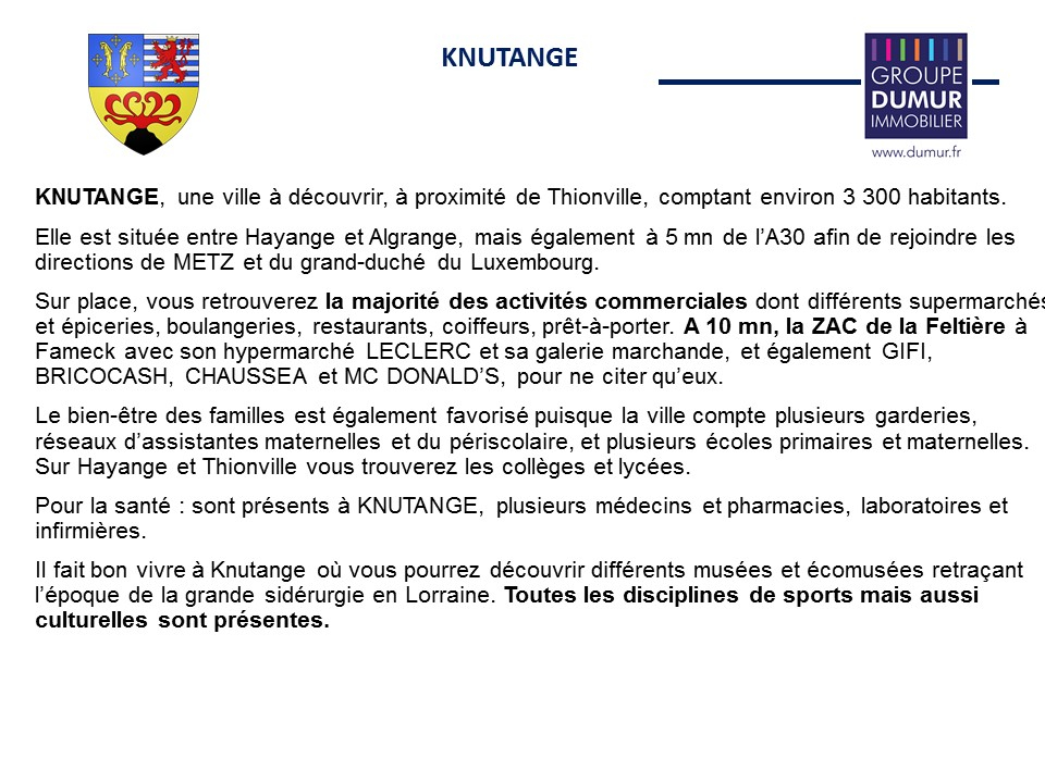 Idéalement situé à Knutange, à proximité des commodités et des transports, avec un accès rapide à Thionville et aux principaux axes vers le Luxembourg.