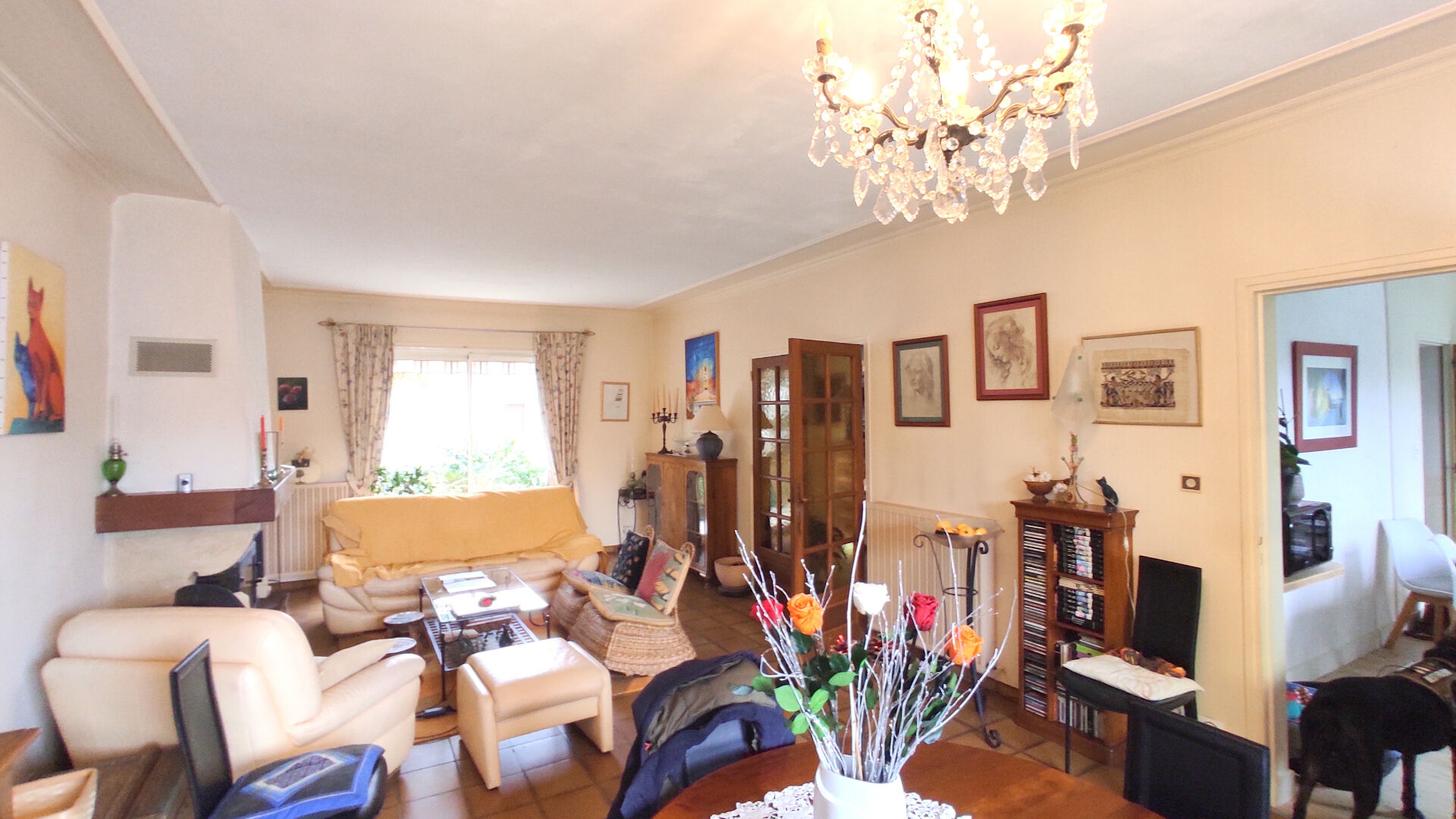 A l'étage: palier, deux chambres, bureau, salle de bains, wc, salle de cinéma, bibliothèque.