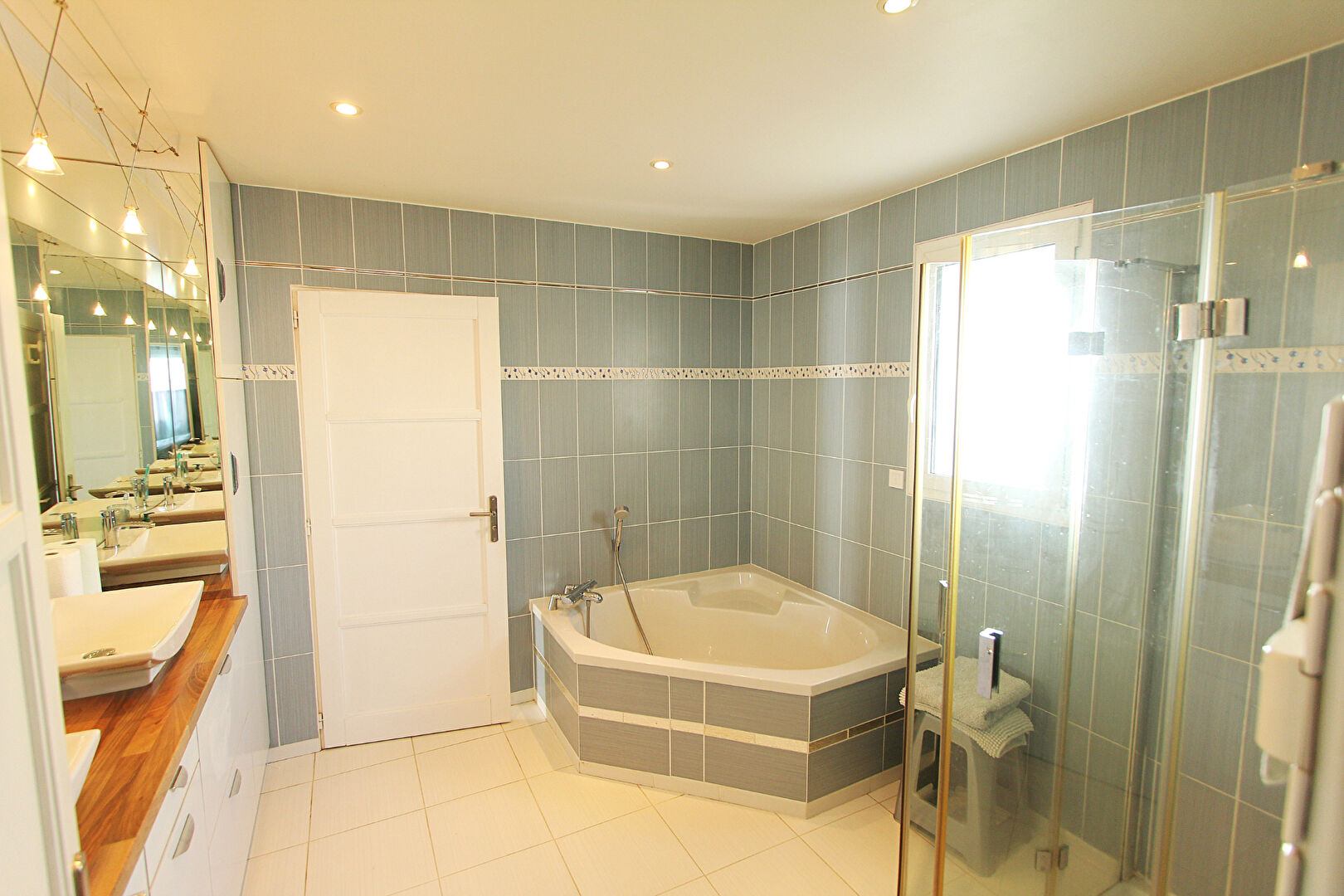 Ce bel espace intègre une grande cuisine américaine équipée, ouverte sur 2 terrasses, un salon / salle à manger, bénéficiant d'une cheminée Polyflam avec accès sur la piscine. Quatre chambres, une salle de bains et deux wc indépendants.