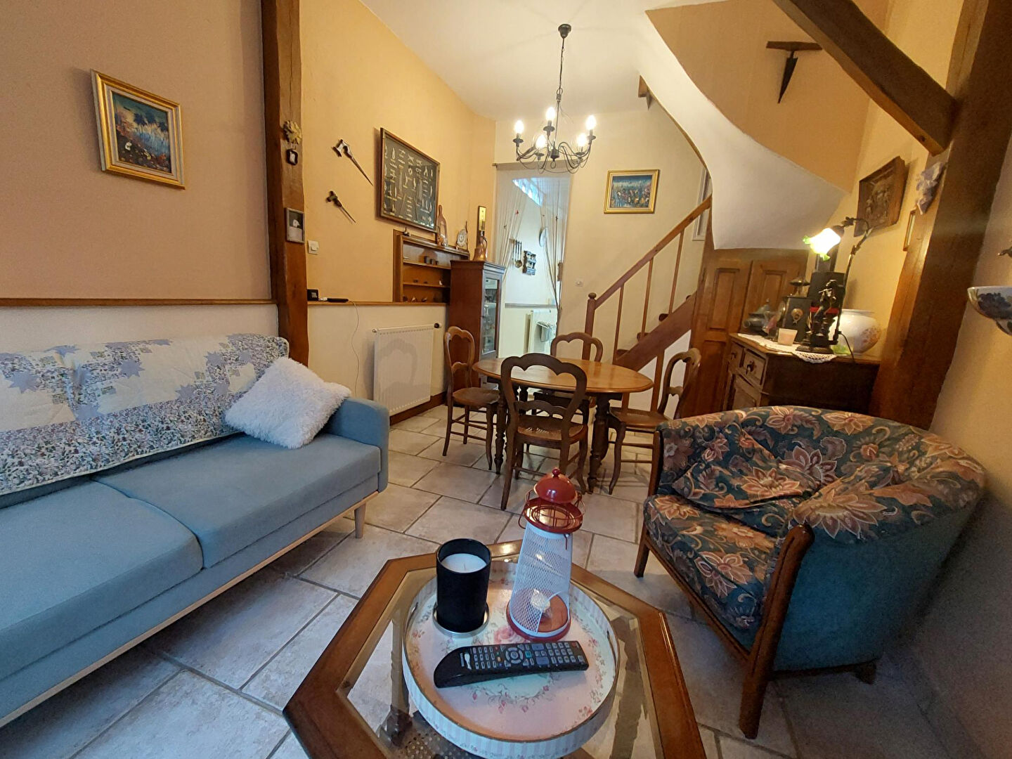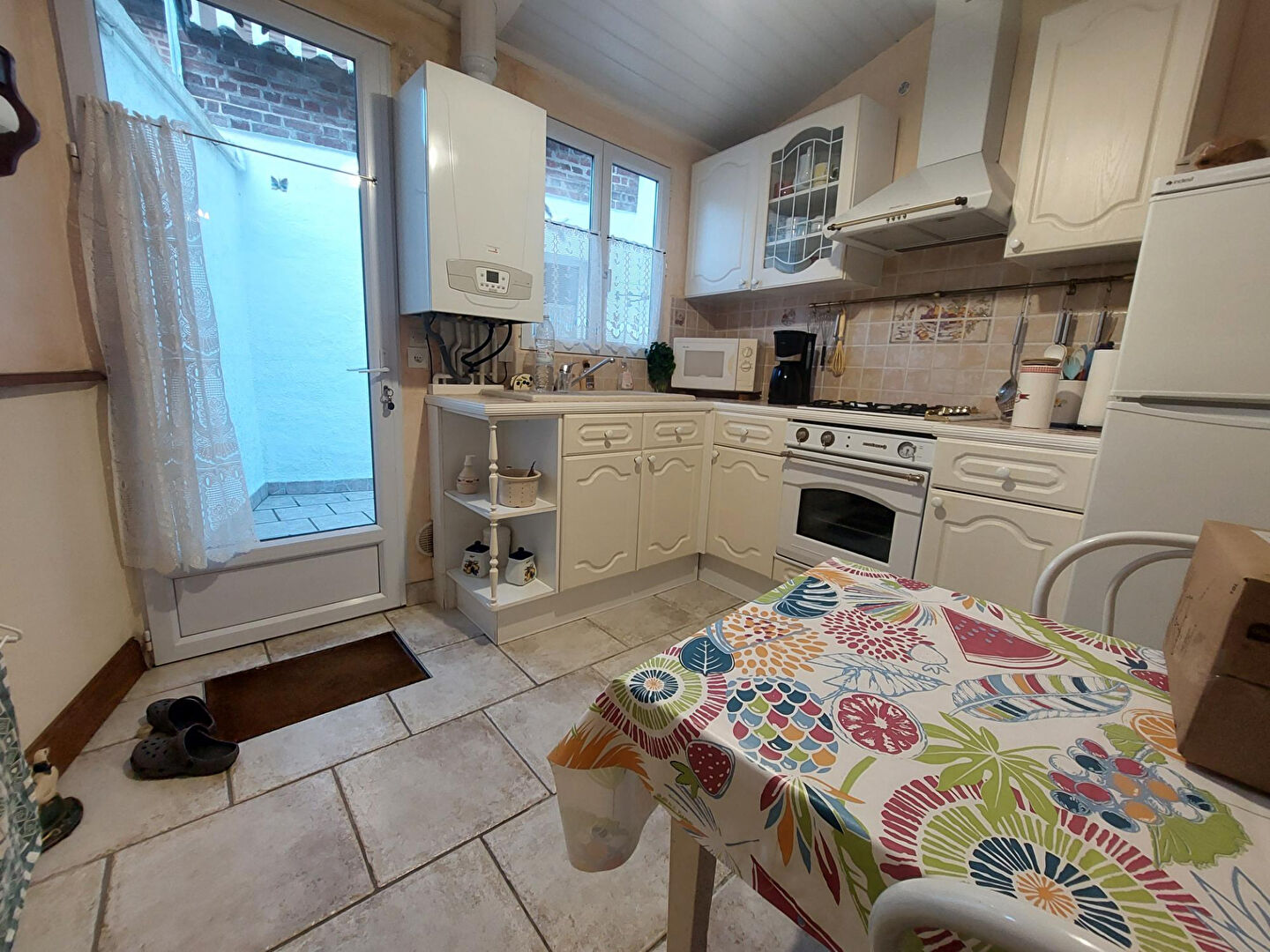 rez de chaussée : pièce de vie (espace salon - salle à manger), cuisine équipée et aménagée, accès cour