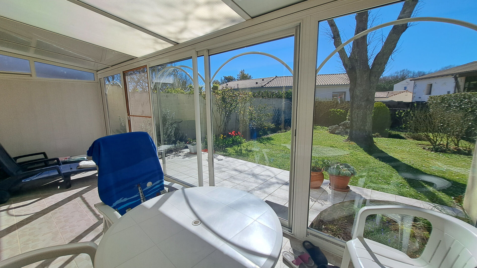 Elle se compose d'une entrée, d'une pièce de vie lumineuse avec salon et salle à manger, ainsi que d'une cuisine traversante ouverte sur une véranda exposée sud-ouest, idéale pour profiter de la lumière et des belles journées.