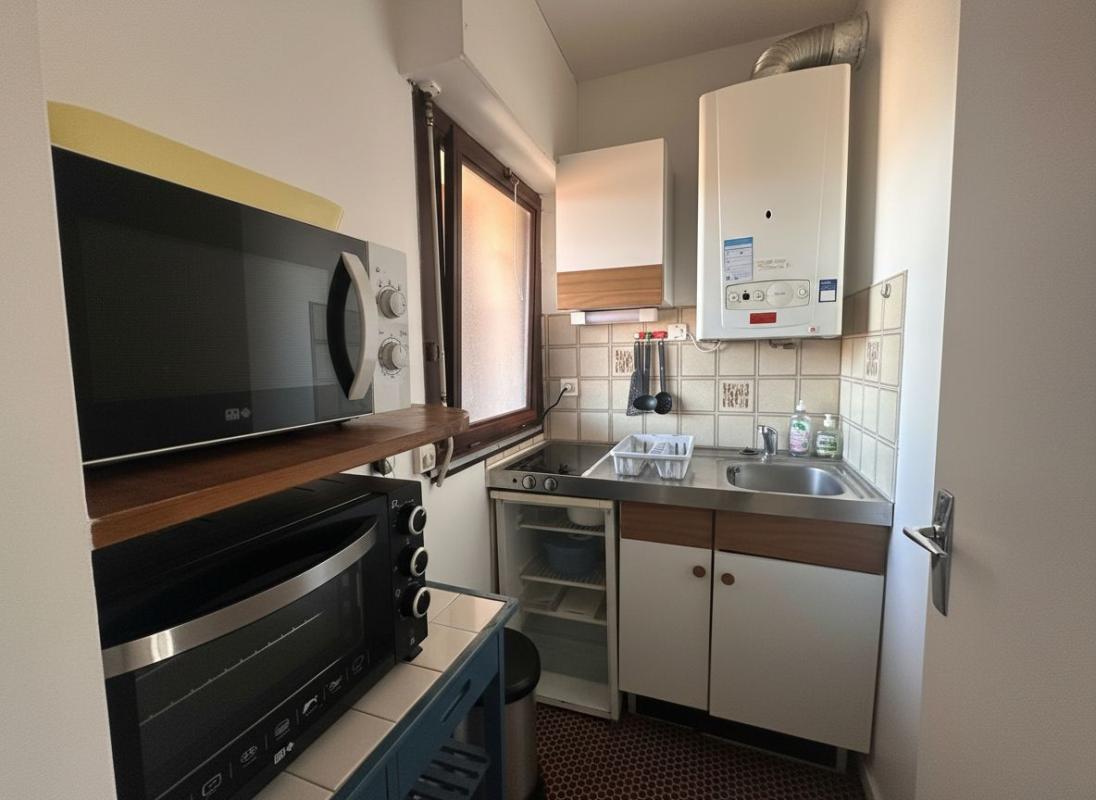 Au 4e étage, ce bien se compose d'une entrée avec placard, d'une kitchenette fonctionnelle, d'une salle de bains, de toilettes séparées, ainsi que d'une pièce de vie lumineuse de plus de 15 m², facile à aménager selon vos envies