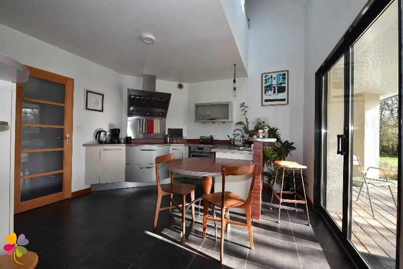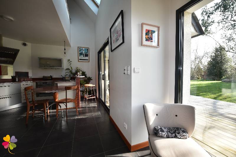 Au rez-de-chaussée, un chaleureux séjour-salon équipé d?un poêle à bois prolongé par une cuisine aménagée et entièrement équipée ouvrant sur une terrasse en bois et le jardin.