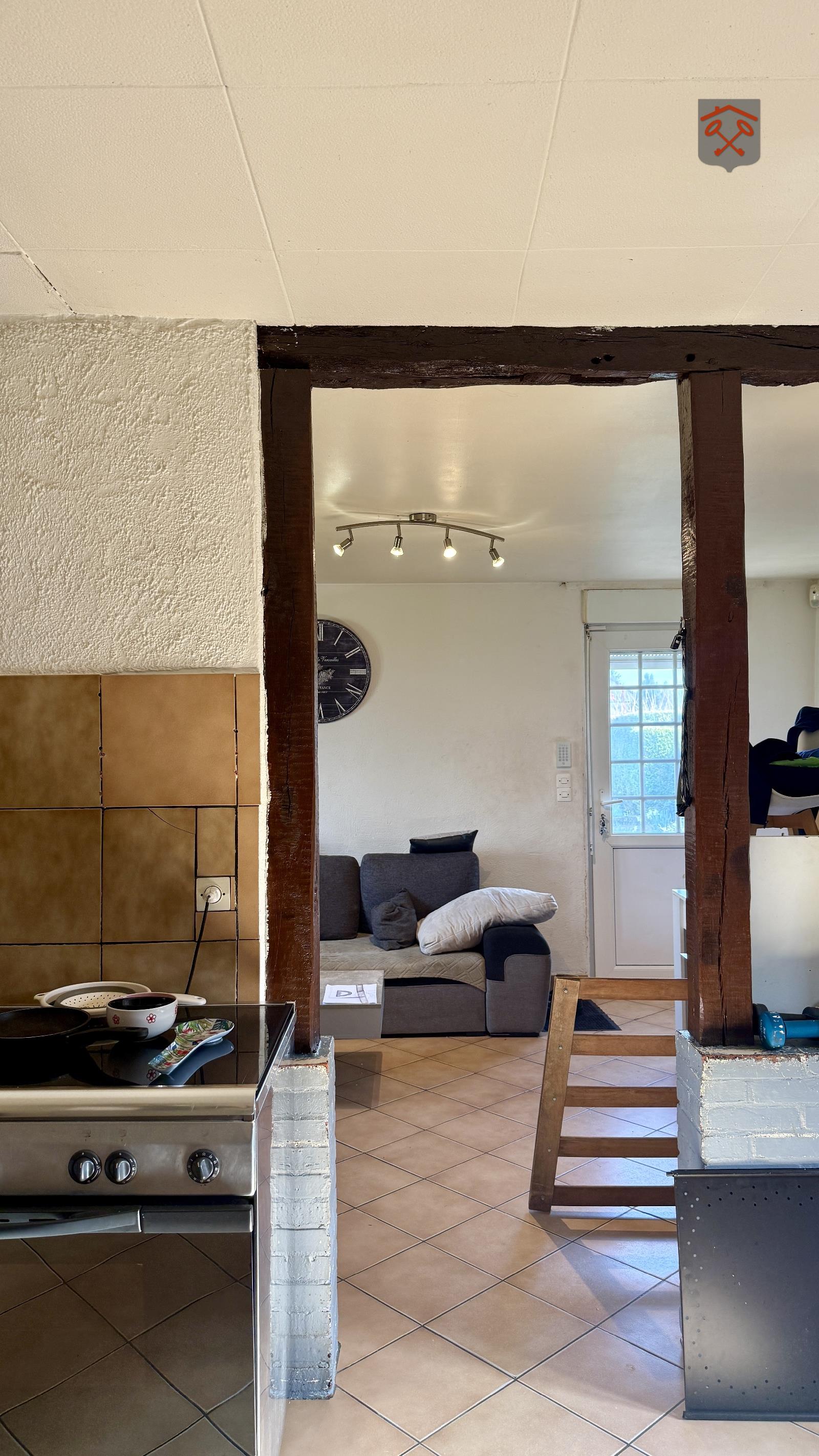 Séjour et cuisine ouverte, salle d'eau, wc.