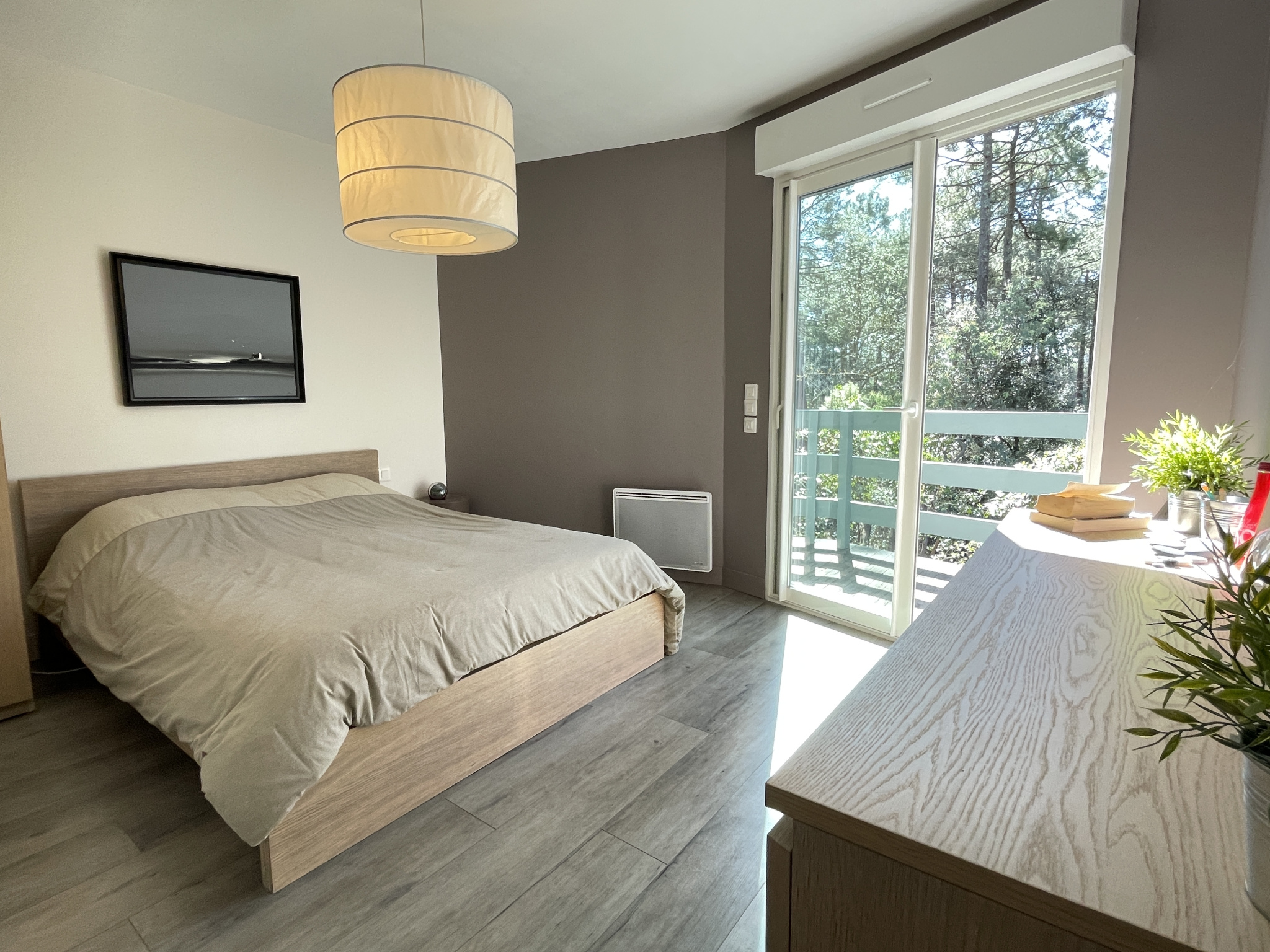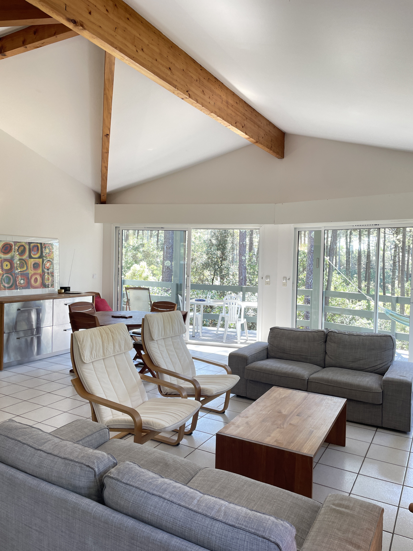 Comprenant un grand salon séjour avec cuisine ouverte, donnant sur une belle terrasse surplombant le golf et la forêt, avec le lever du soleil