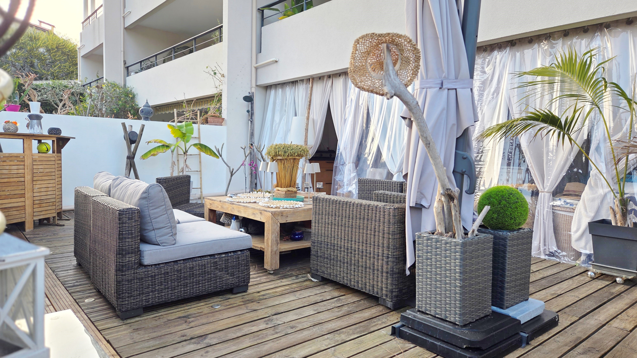 Dans une petite copropriété de standing, idéalement située à proximité immédiate des commodités et à seulement 10 minutes des plages, laissez-vous séduire par ce superbe appartement en rez-de-jardin avec accès direct à la piscine.