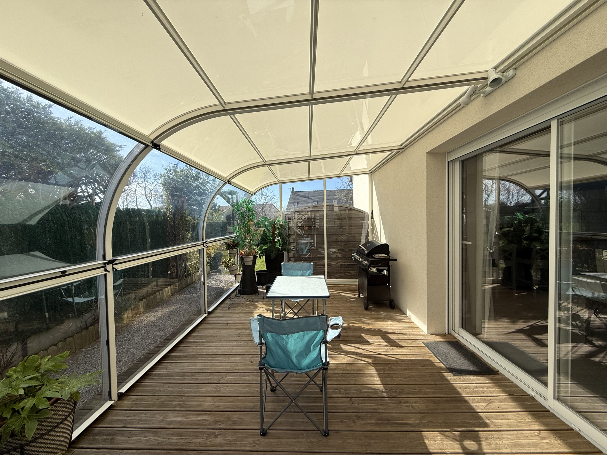 Jolie pergola entièrement coulissante qui donne sur un jardin arboré et totalement clos.