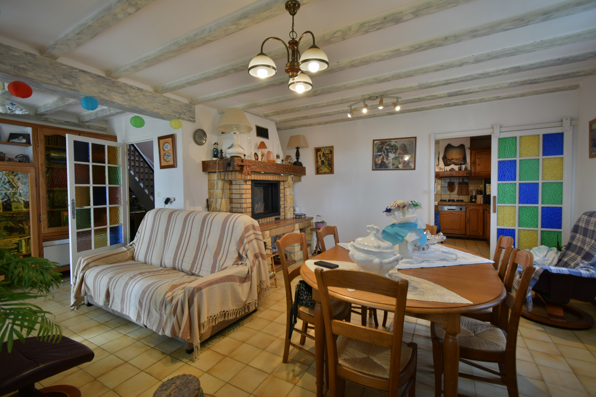 -d'un salon lumineux d'environ 30 m2 avec ouverture sur la terrasse. Il est équipé d'un insert double face chauffant l'espace salon d'un côte et de l'autre l'espace dégagement avec la chambre et le bureau.