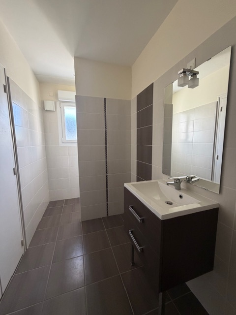 - au rez-de-chaussée : Hall d'entrée commun, entrée, séjour/salon, couloir avec placard, cuisine avec évier et meuble, wc, salle d'eau avec douche à l'italienne, meuble vasque et placard, une chambre avec placard ;