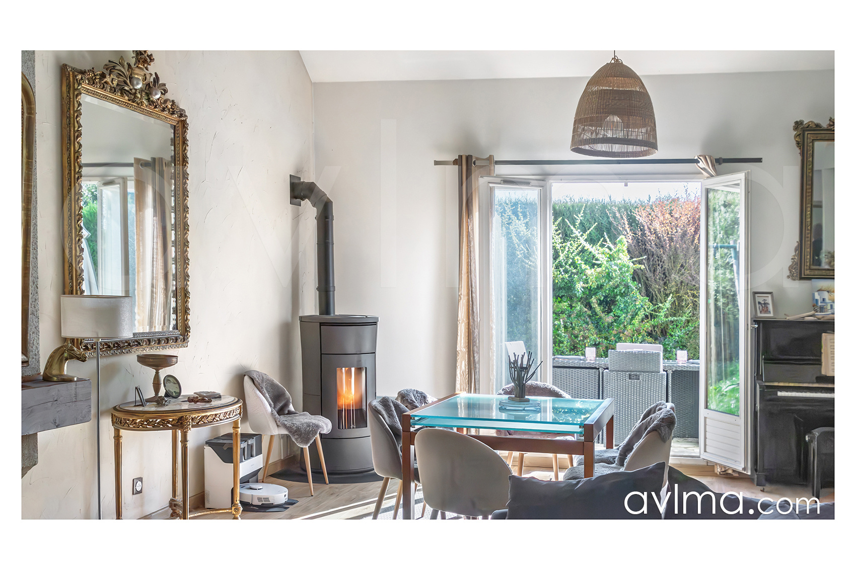 Dès l'entrée, vous découvrez un spacieux séjour de 53 m2 avec plafond cathédrale, baigné de lumière et agrémenté d'un poêle à bois, offrant un espace de vie chaleureux et convivial. La cuisine indépendante de 14 m2, ainsi qu'une buanderie, complètent ce niveau. Le rez-de-chaussée accueille également trois chambres, bien séparées de l'espace de vie par un couloir, dont une suite parentale avec dressing, salle de bain et douche. Une seconde salle de bain dessert les deux autres chambres, ainsi qu'un toilette invités.