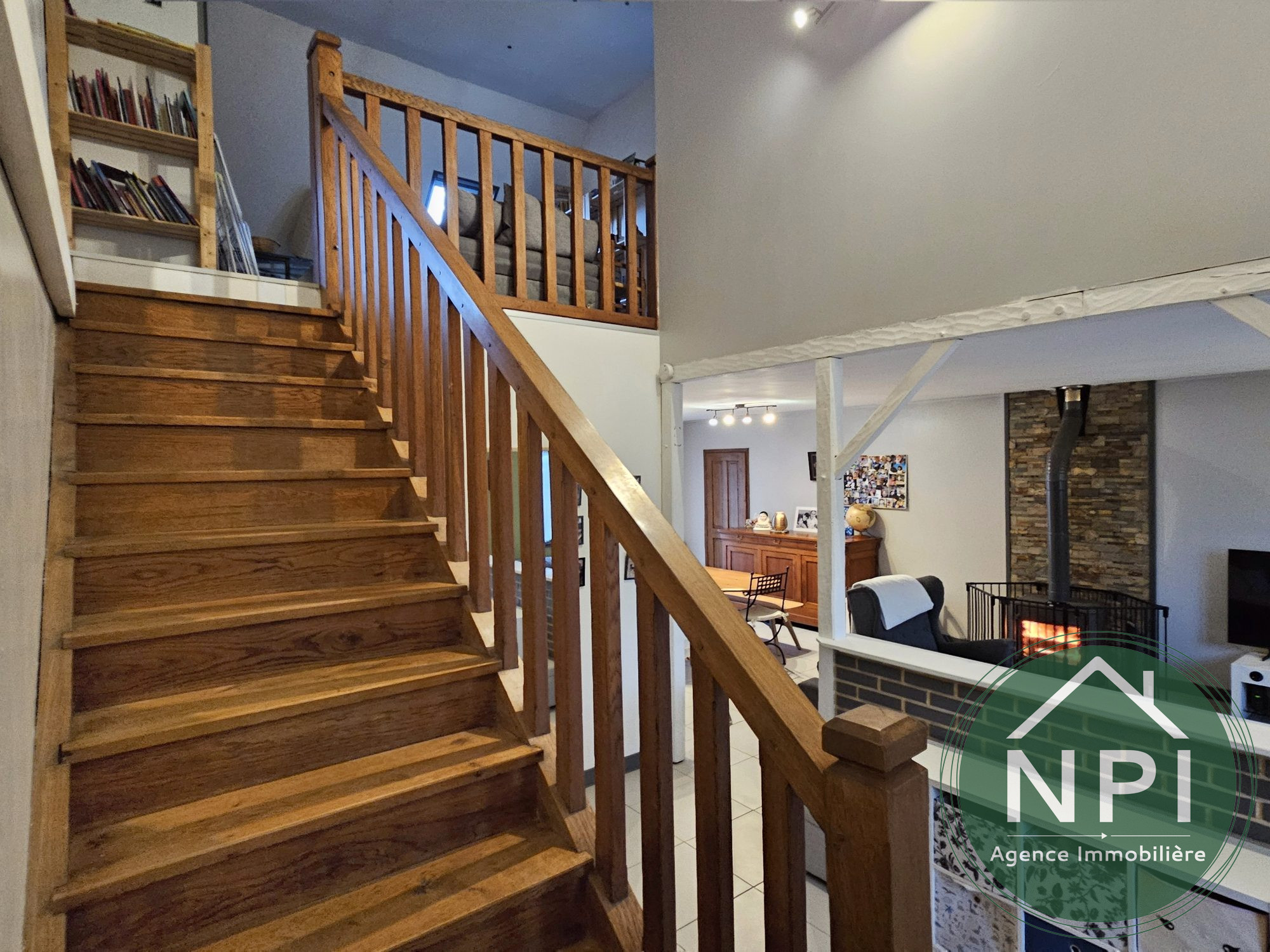 Maison individuelle comprenant au RDC : une entrée cathédrale avec rangements, salon/séjour double traversant avec poêle à bois, cuisine américaine avec îlot central, aménagée et équipée, cellier, une chambre, une salle de bains, un bureau pouvant faire office de chambre et wc séparés.