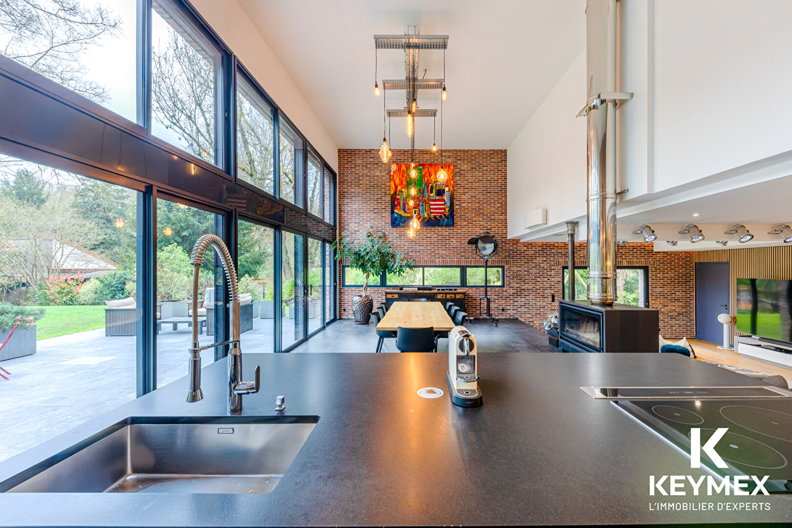 La pièce de vie, baignée de lumière et largement ouverte sur le jardin paysager, offre un espace de réception d'exception sublimé par une cuisine haut de gamme et des matériaux nobles.