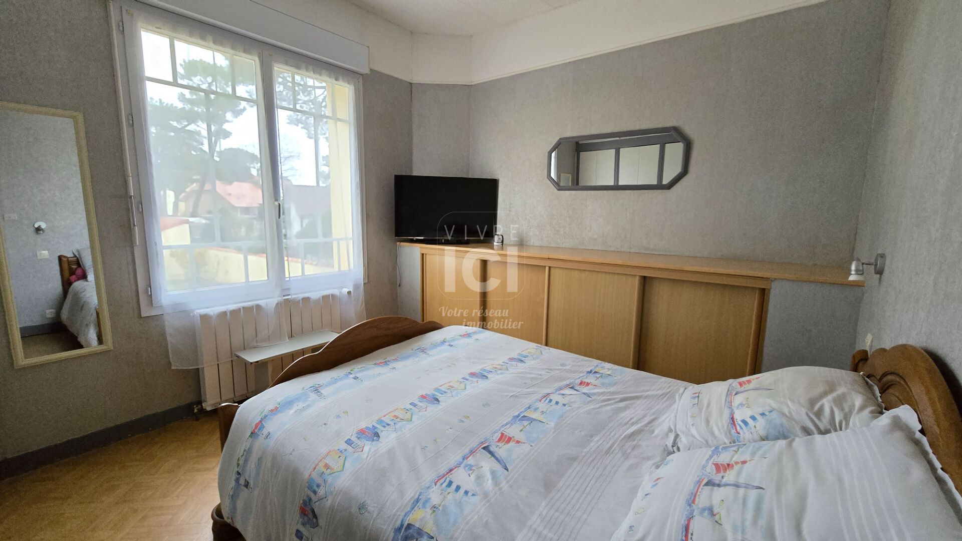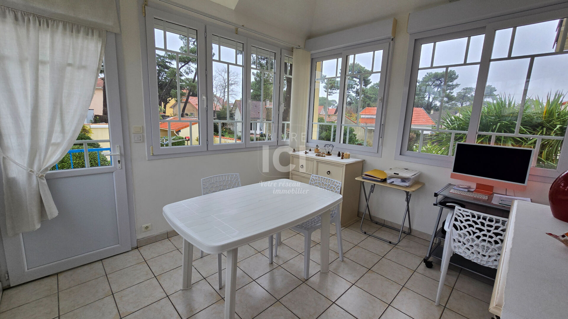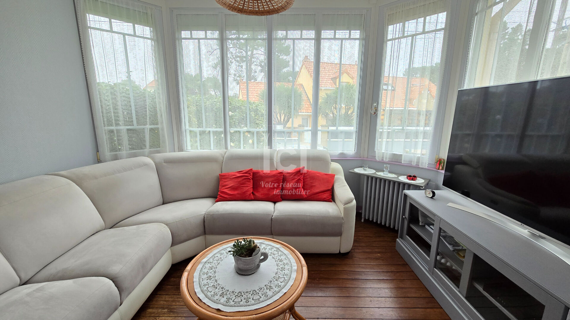 LES SYLPHES - Au calme à 150 m de la mer, villa Brévinoise pleine de charme de 140 m² ! Le rez de chaussée surélevé comprend : hall d'entrée, séjour-salon avec belle hauteur sous plafond, cuisine aménagée équipée, cellier, chambre (placards), salle d'eau, wc, véranda.