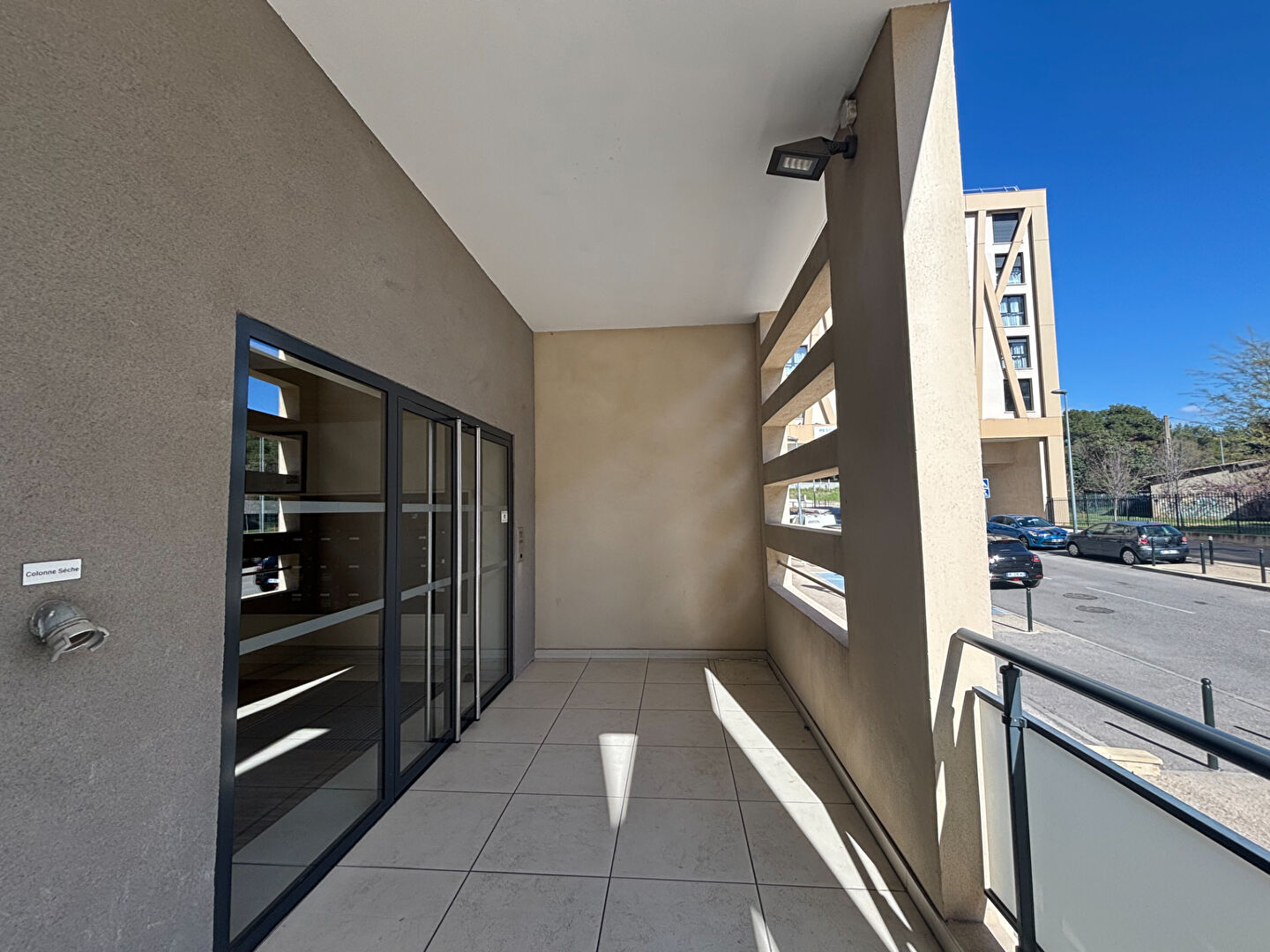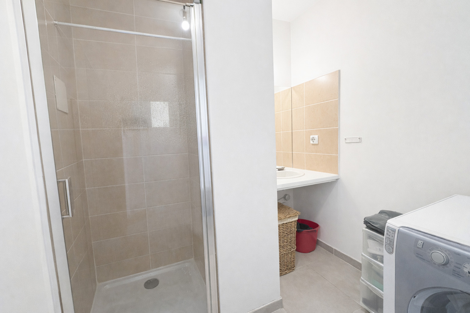 L'appartement dispose également d'une chambre de belle dimension avec accès direct à la terrasse, ainsi que d'une grande salle d'eau avec WC et emplacement pour machine à laver.