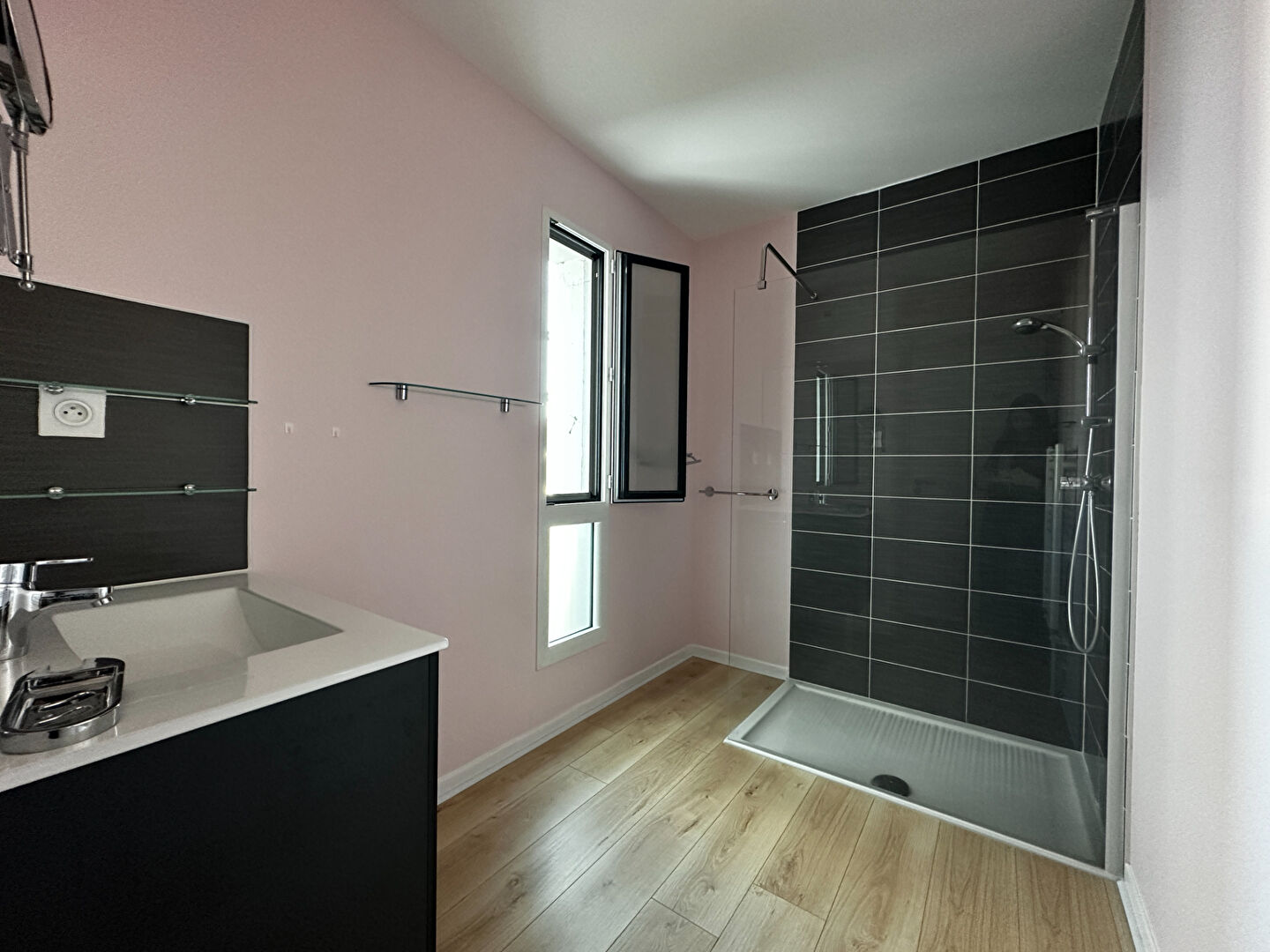 Il comprend une entrée, une pièce de vie lumineuse de plus de 20 m² avec sa cuisine ouverte aménagée et équipée, ainsi qu'une terrasse couverte avec un cabanon.
