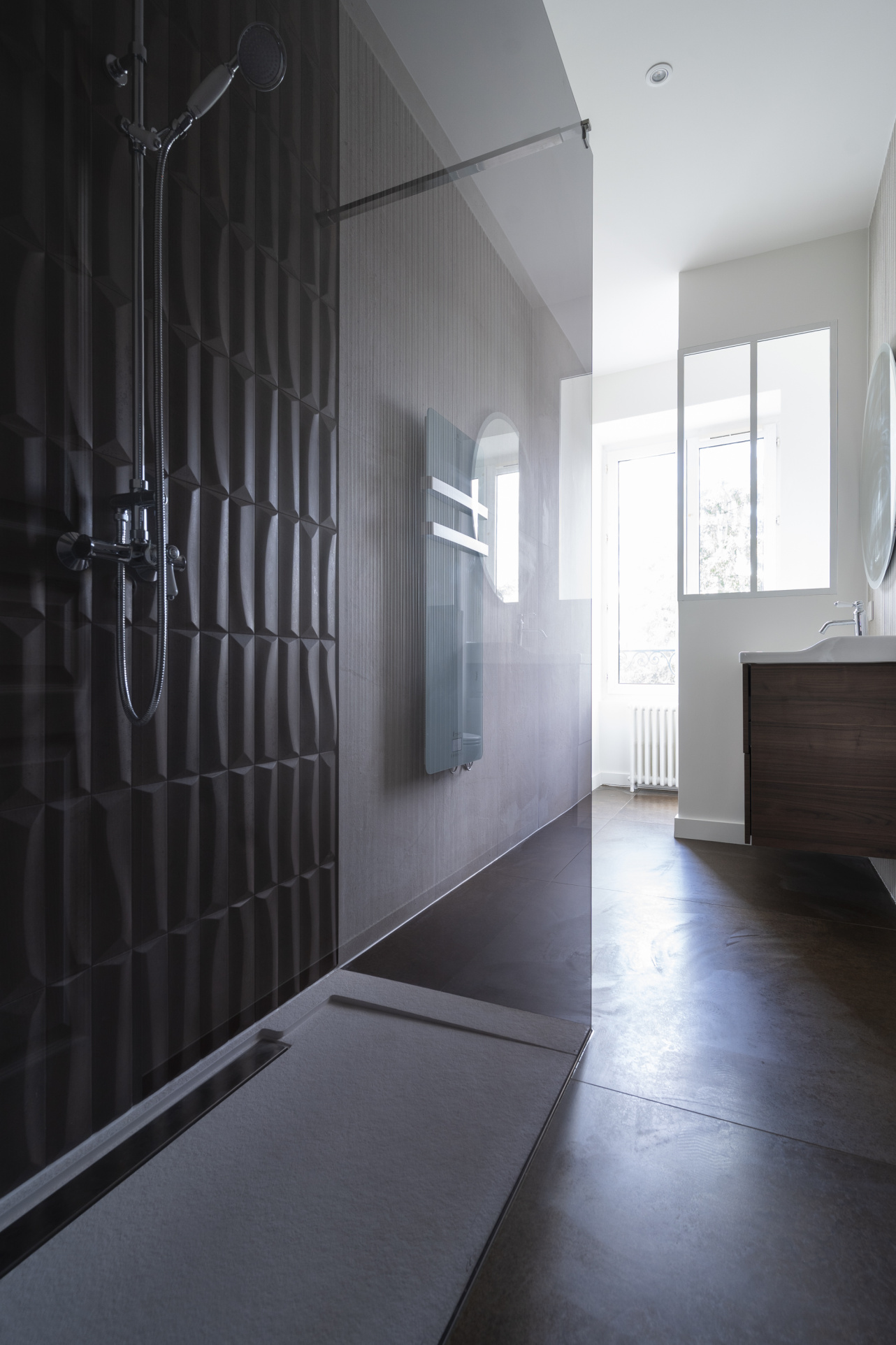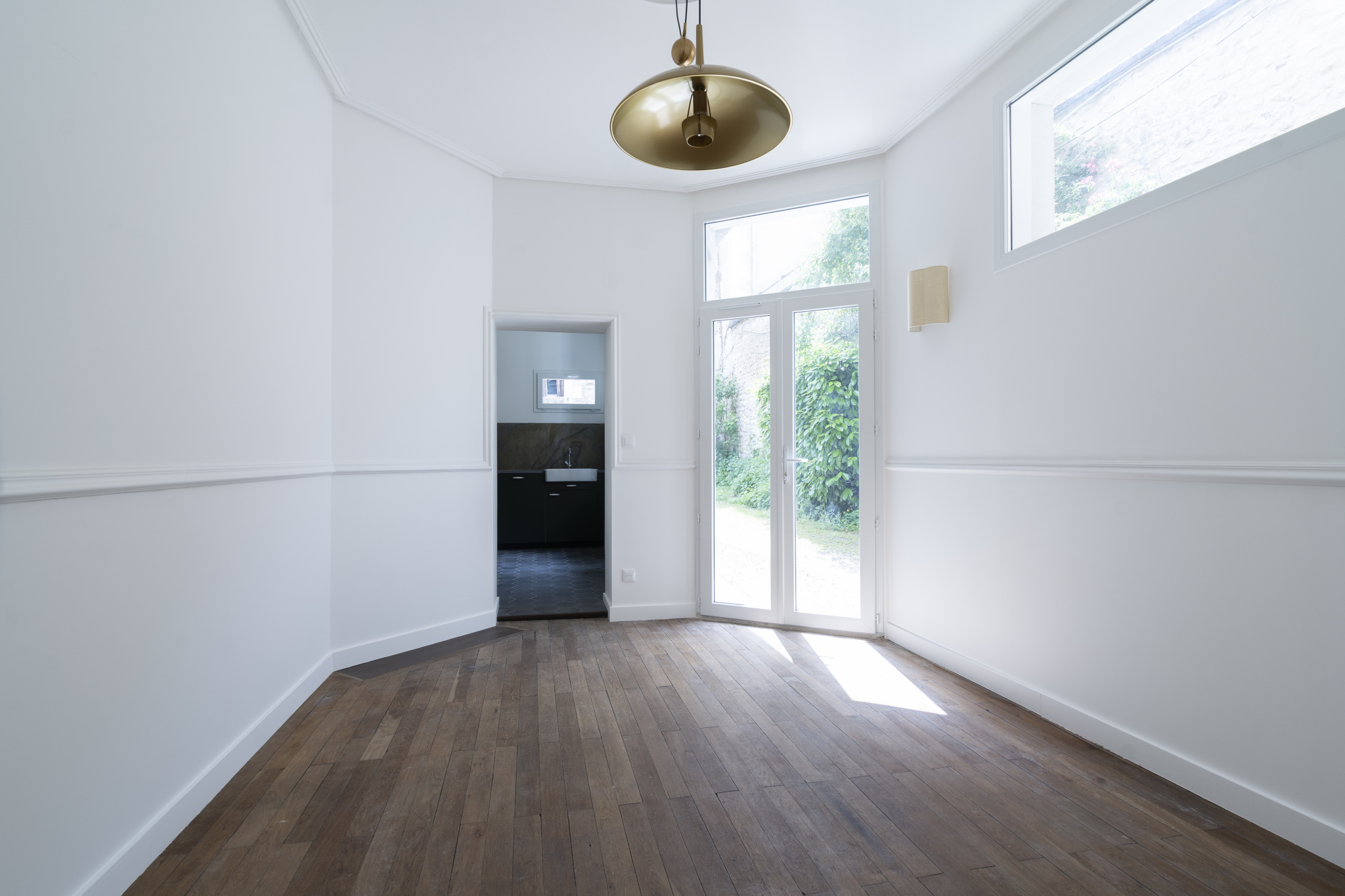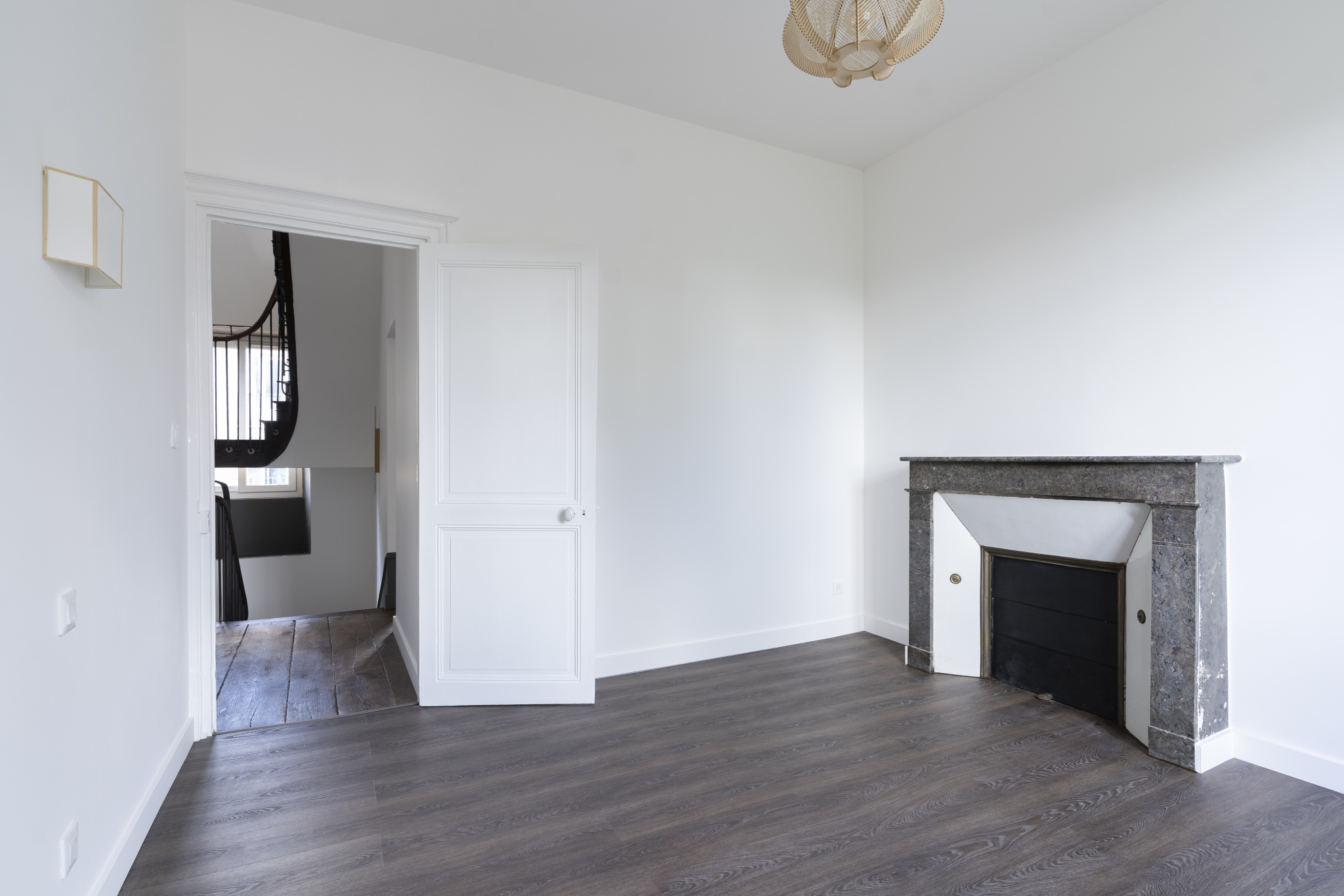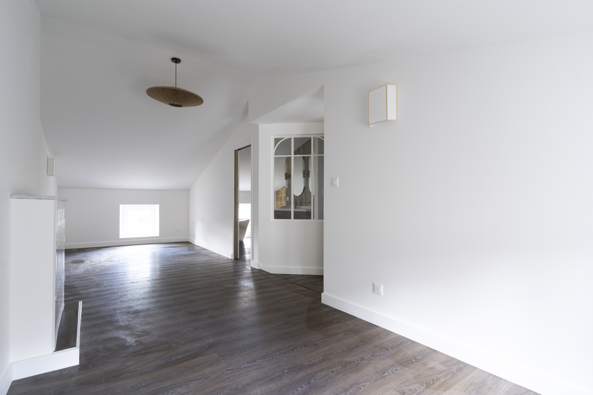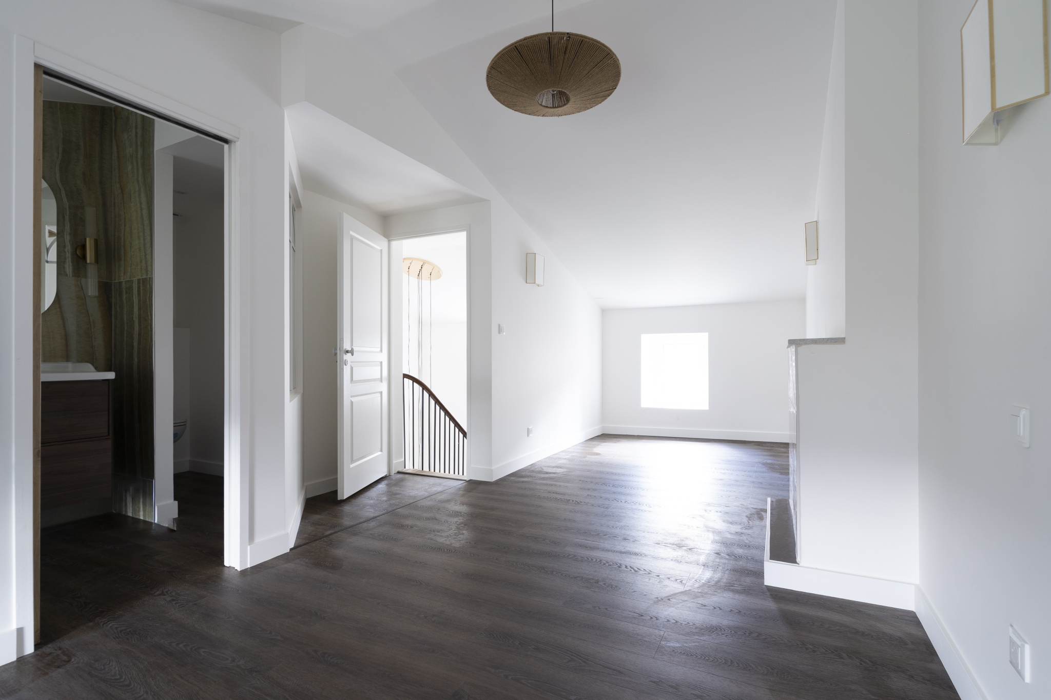 Le dernier niveau de la maison est entièrement dédié à la suite parentale : un plateau traversant de 31 m2, avec parquet massif, cheminée décorative, coin dressing et salle d'eau d'exception. Celle-ci s'organise autour d'un meuble suspendu à double vasque, surmonté d'un plan en marbre naturel aux nuances dorées et vertes, mis en valeur par deux miroirs symétriques. L'espace bain propose une configuration modulable, entre l'élégance d'une baignoire îlot centrale et le confort d'une douche à l'italienne aux lignes épurées.