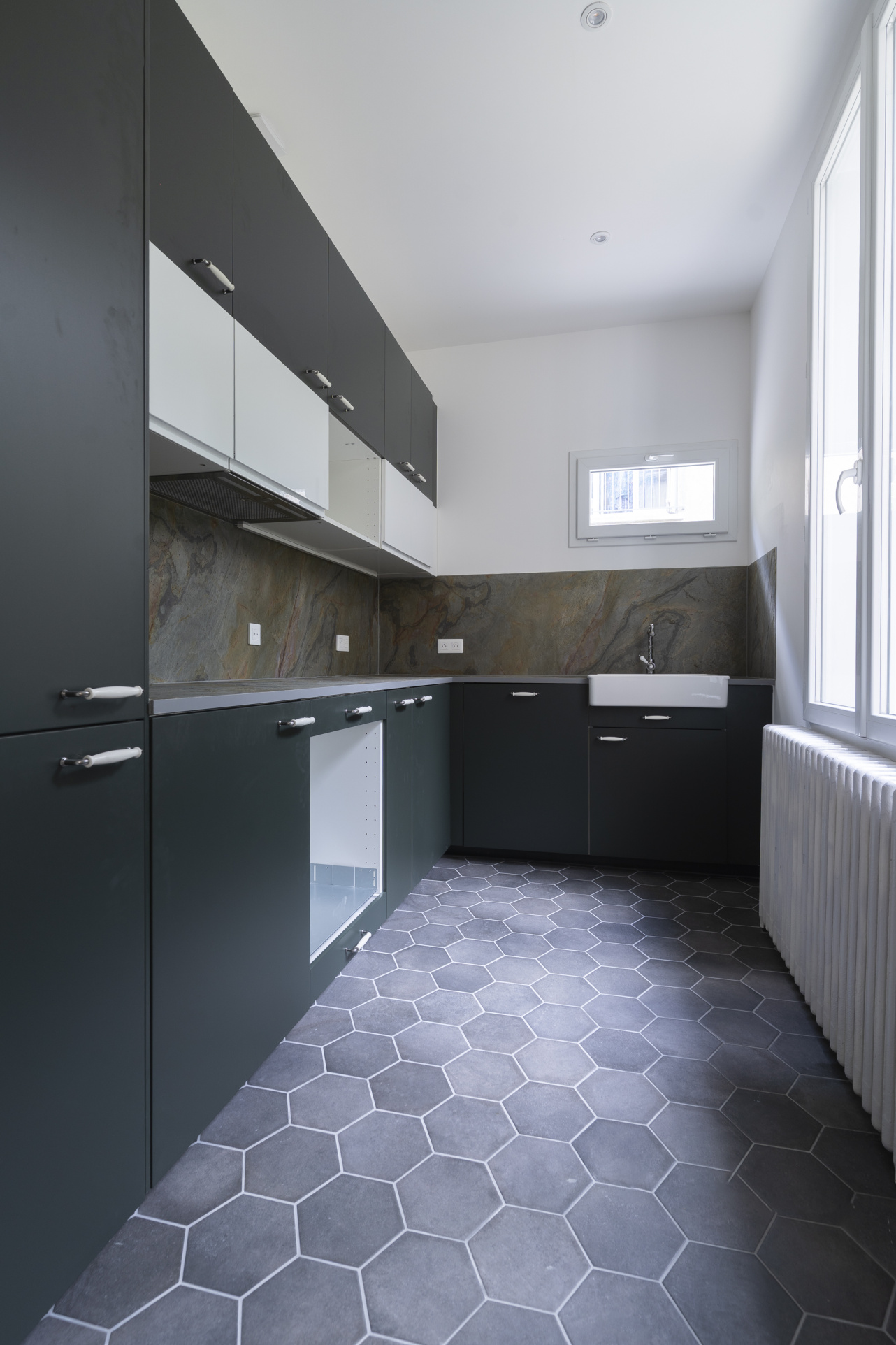 Dans un style épuré mais toujours soigné, la salle à manger mène à une cuisine raffinée, équipée d'un sol en tomettes grises, d'un mobilier de qualité, d'un plan de travail en feuille de pierre naturelle veinée et d'une vasque en porcelaine.