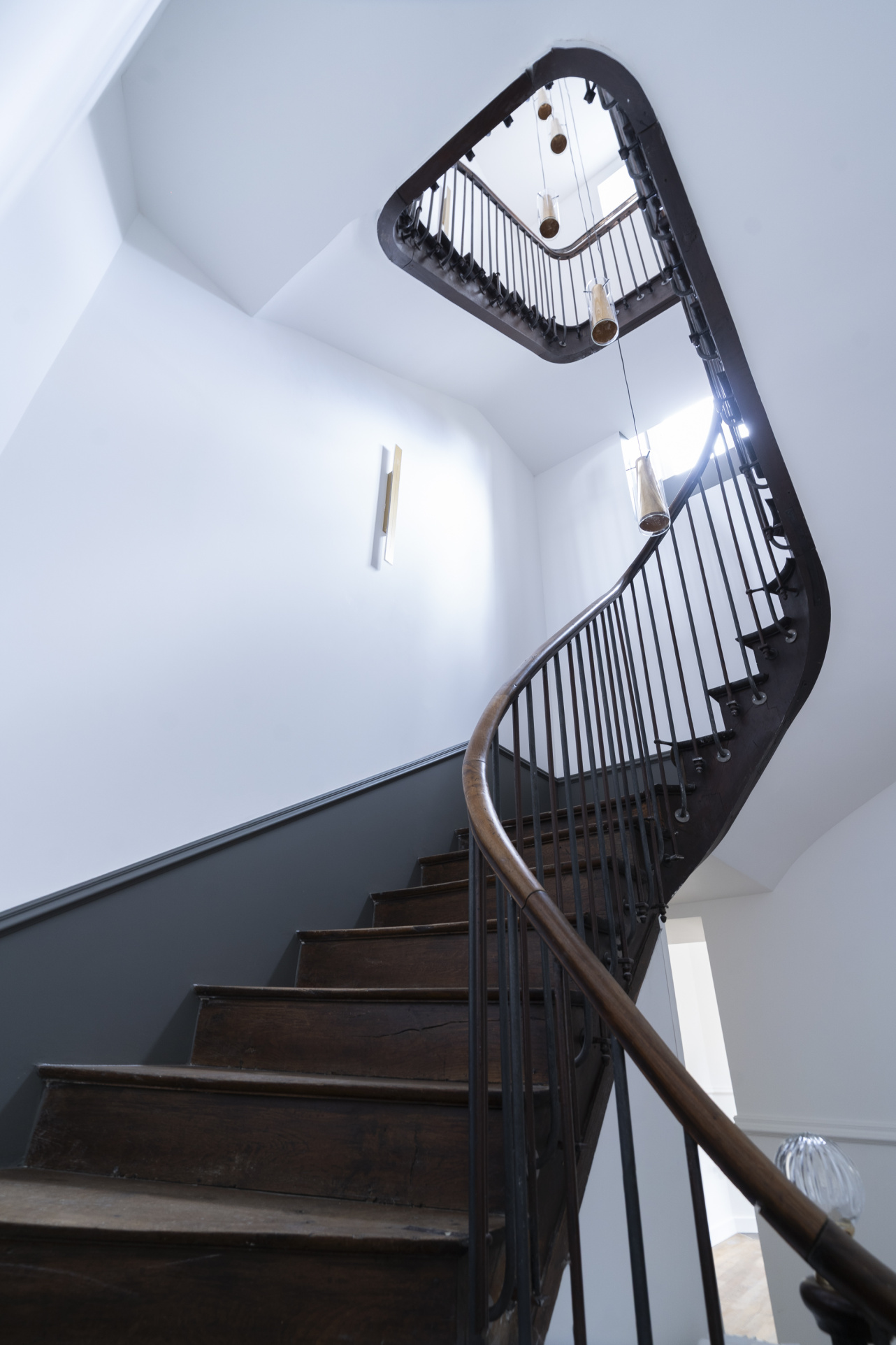 Coup de coeur assuré pour l'escalier hélicoïdal de 8 mètres de haut, doté de marches en bois massif et orné d'un lustre en verre et dorures sur mesure. Le vestibule dessert un salon chaleureux et lumineux, avec parquet massif, moulures élégantes et cheminée décorative en marbre à décor ornemental.