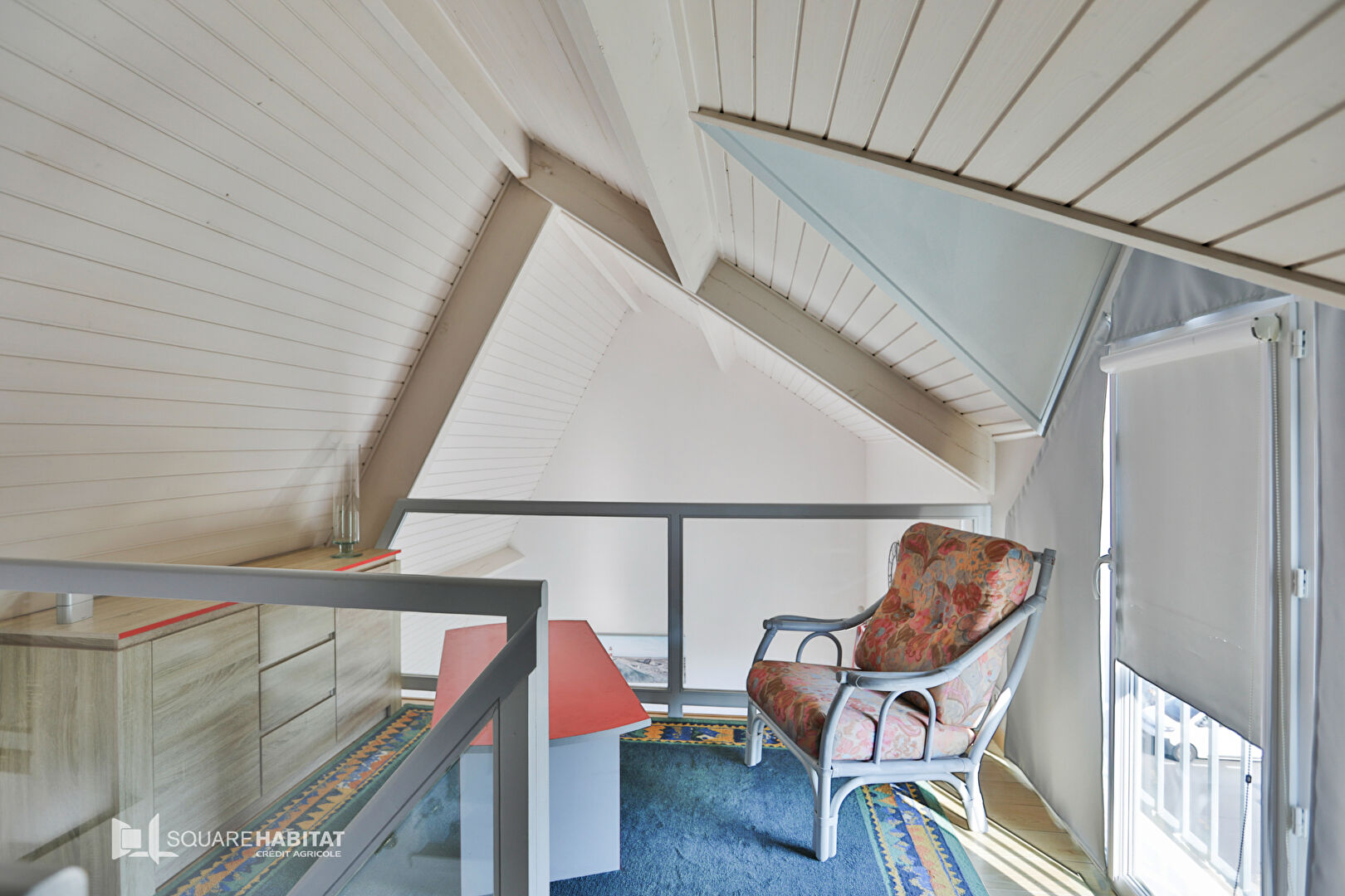 À l'étage, une seconde chambre, une mezzanine polyvalente (bureau, coin lecture ou espace détente) ainsi qu'un WC indépendant complètent l'ensemble.