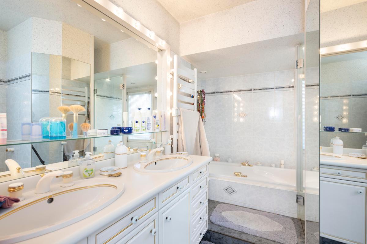 Au sous-sol, vous trouverez un garage, une cuisine, un bureau avec cheminée, une douche et un WC, ainsi qu'une véranda actuellement aménagée en salle de sport.