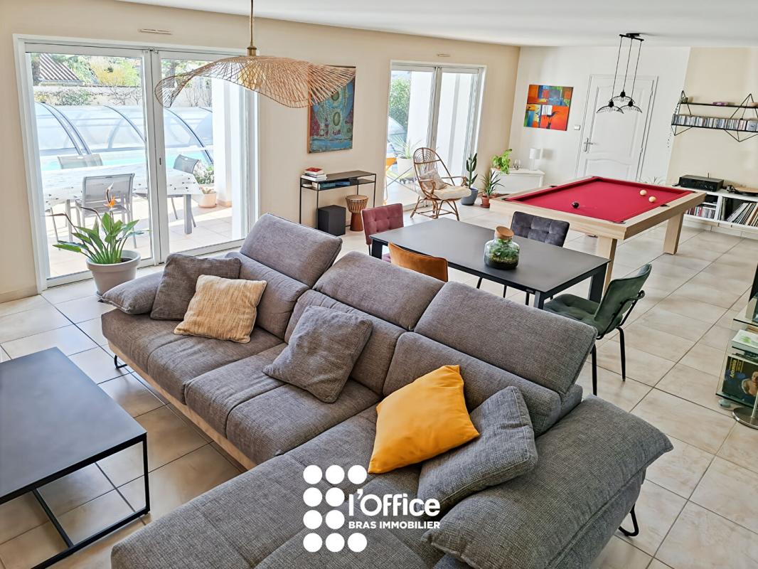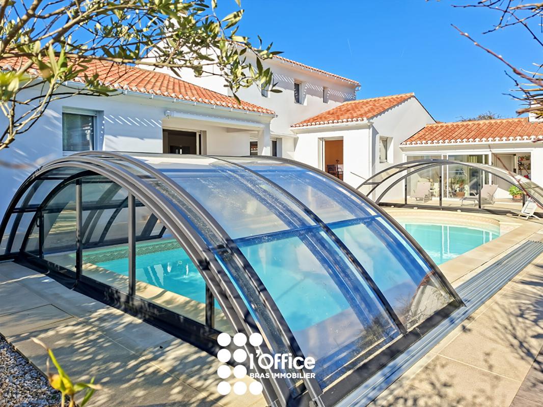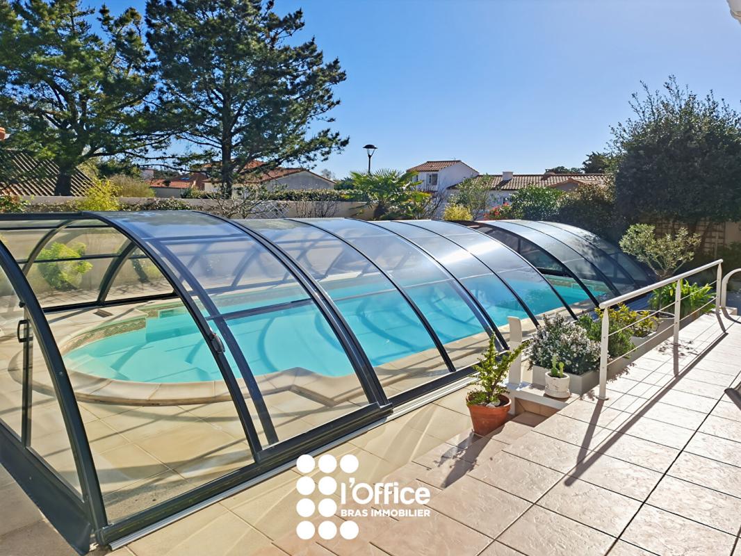 Entre la plage et les commerces de Brétignolles sur mer, l'Office Bras immobilier vous présente En Exclusivité cette magnifique maison familiale comprenant 4 chambres, une grande pièce de vie très lumineuse donnant sur un lieu de vie extérieur arboré avec sa piscine.