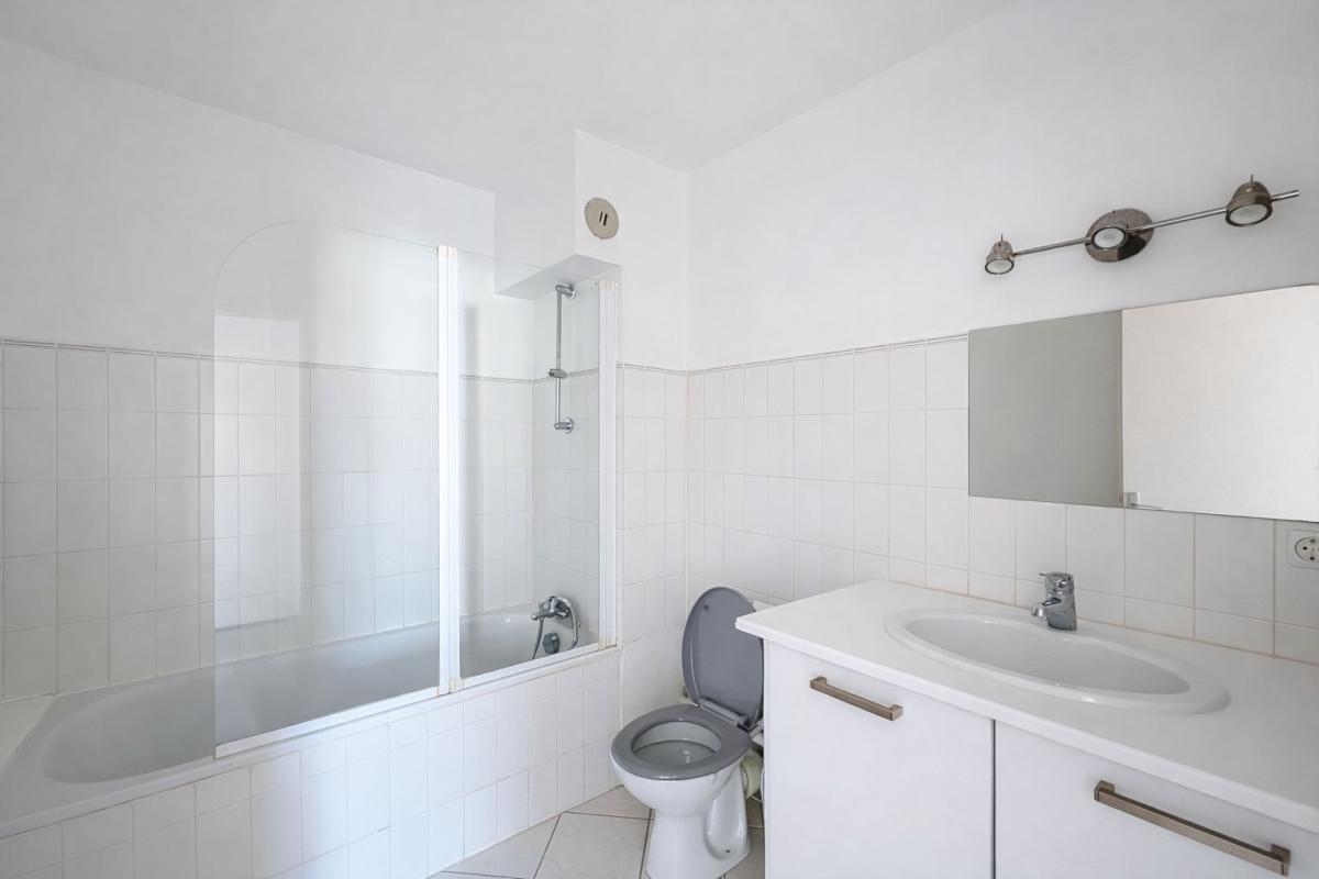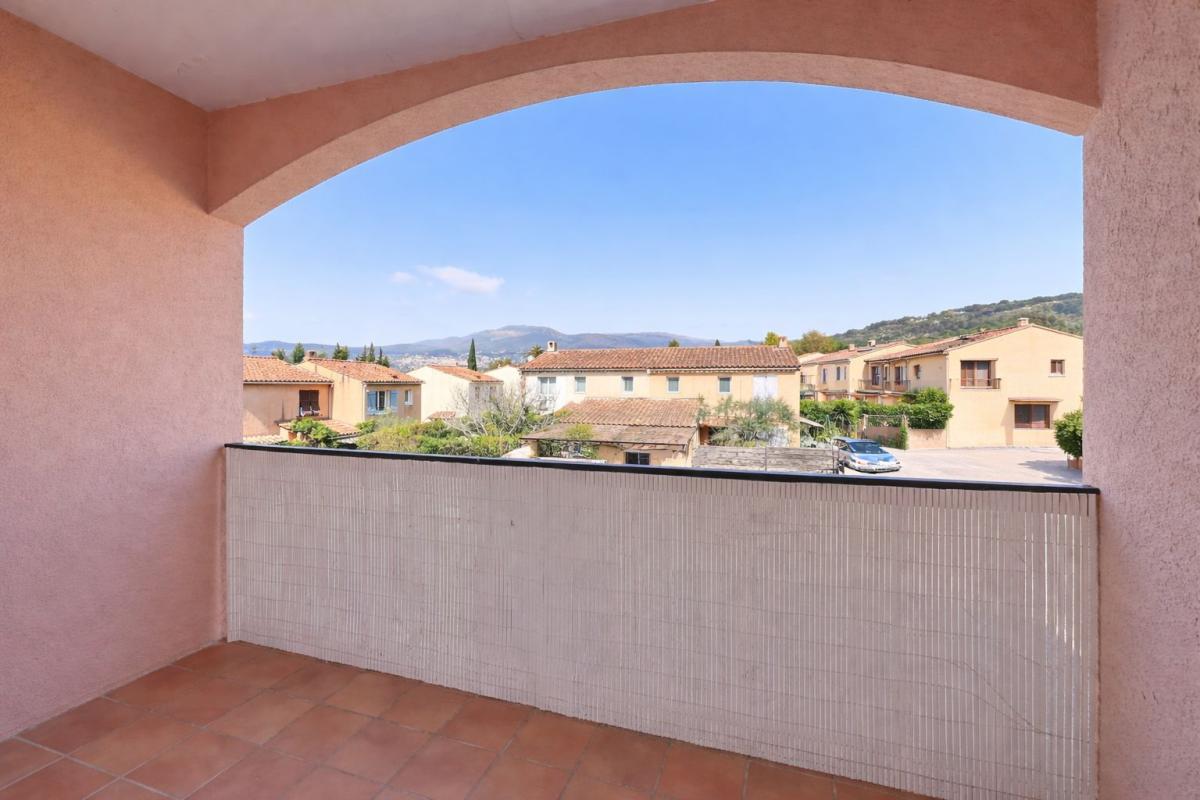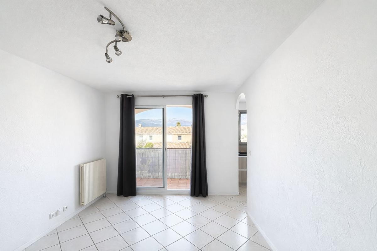 L'espace de vie se compose d'un séjour lumineux ouvrant sur un balcon exposé Ouest avec vue dégagée sur les collines grassoises.