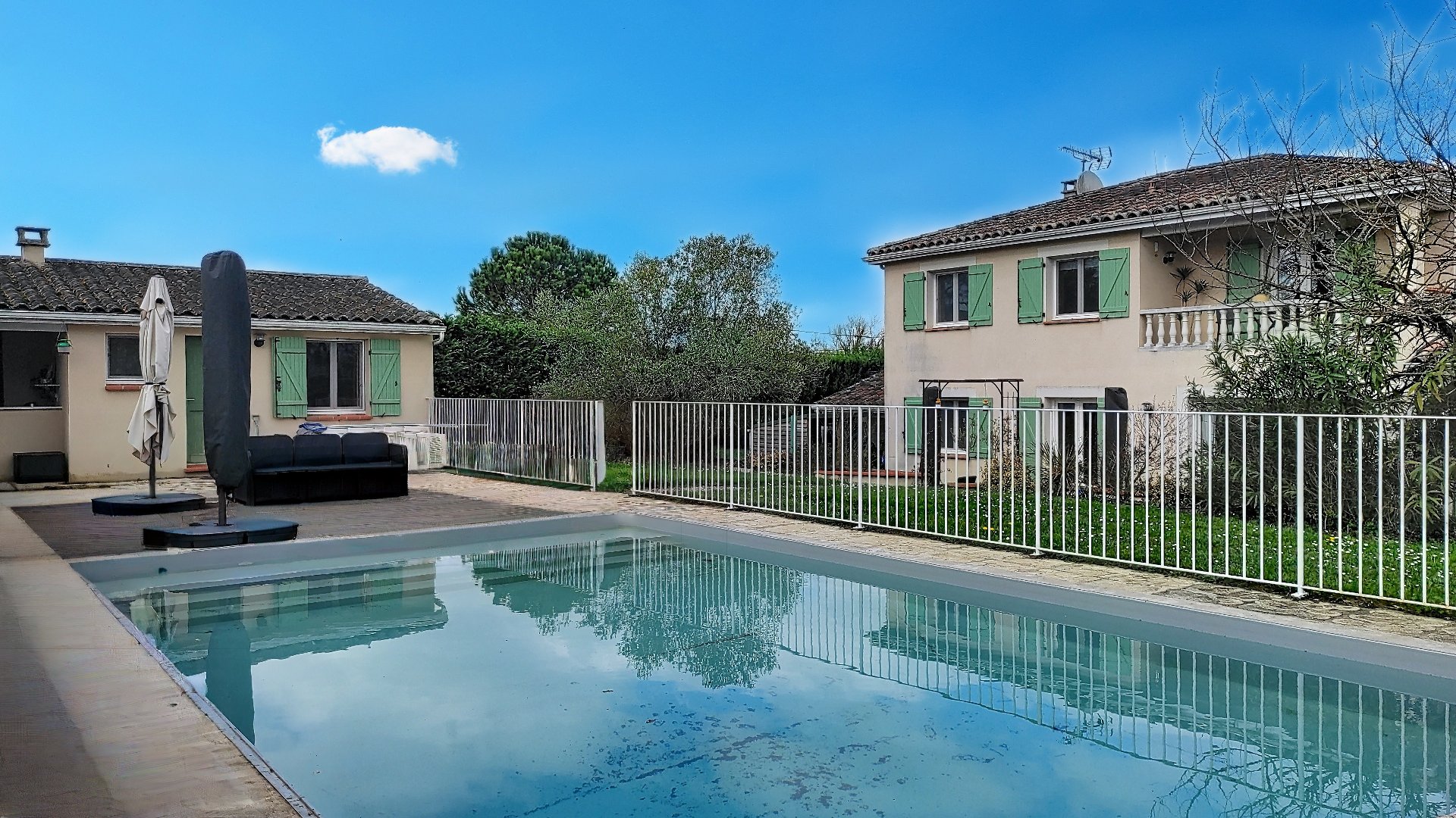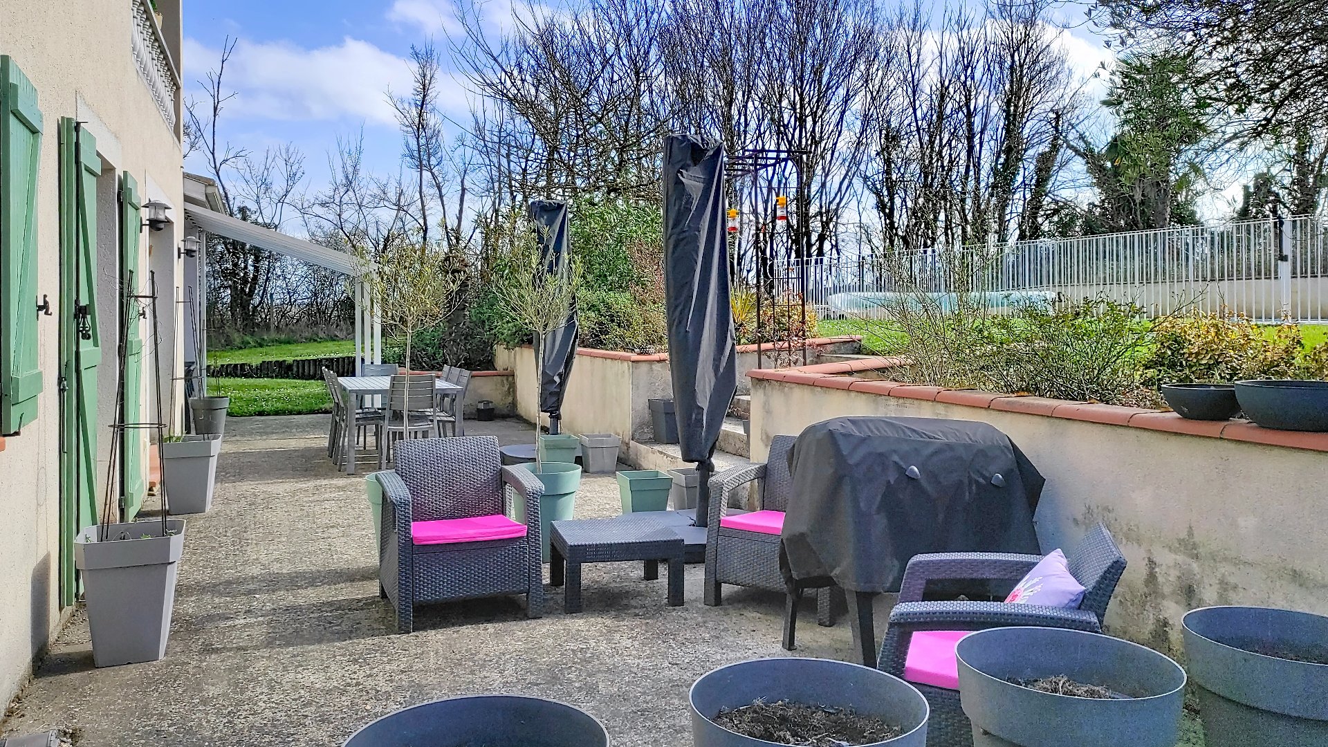 - un lieu de détente autour de la piscine avec une grande plage et à l'abri une terrasse couverte
