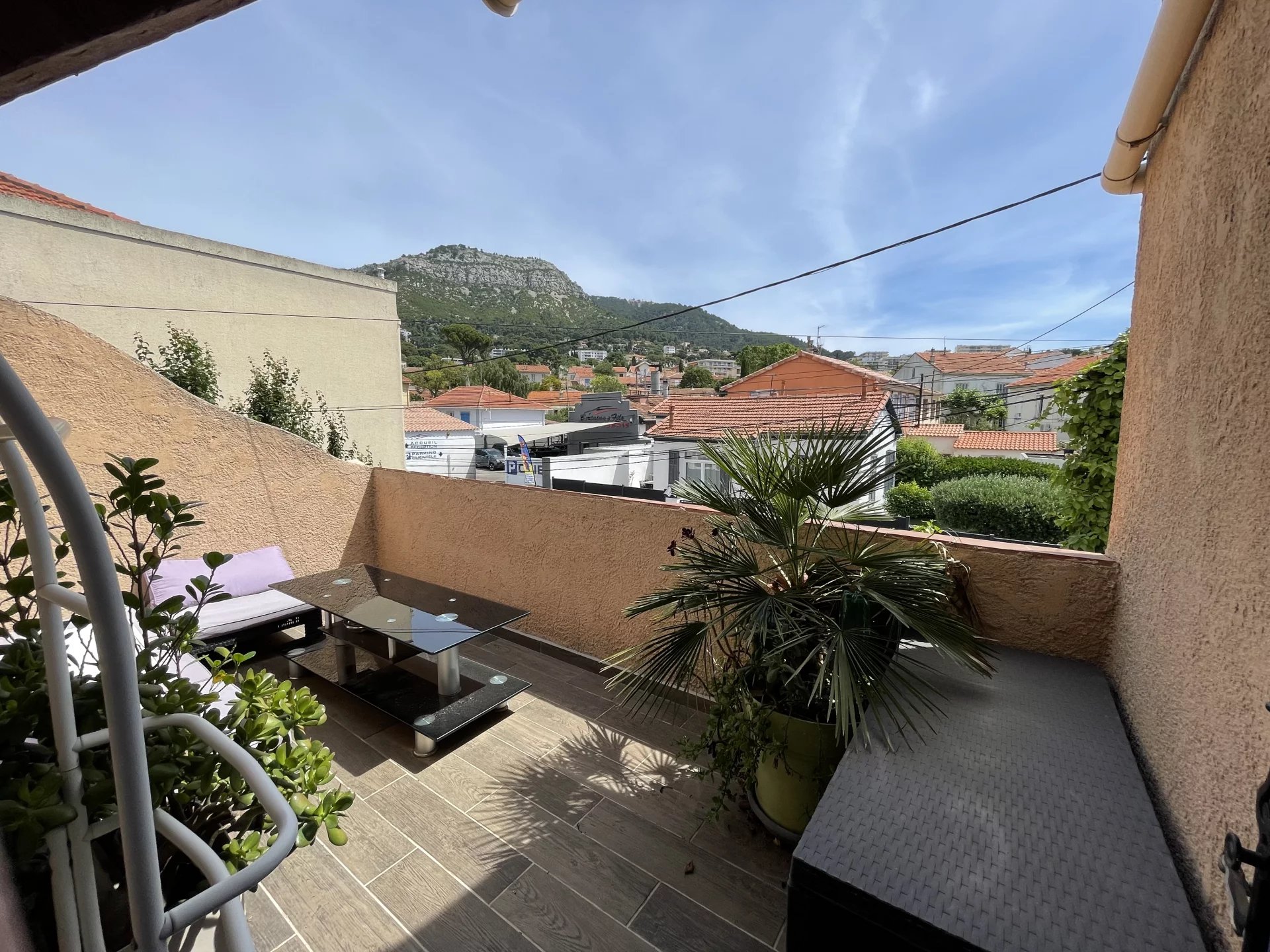 À l'étage : trois chambres, une salle de bain et une grande terrasse avec vue sur le Faron.